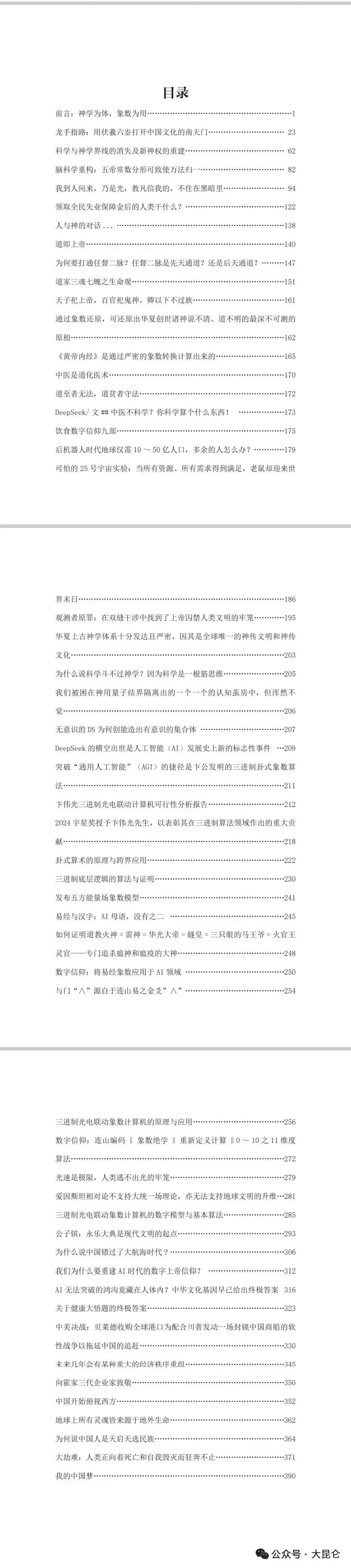 OCR:IMG:地球上所有灵魂皆来源于地外生命 *..362 为何说中国人是天启天选民族 364 大劫难:人类正向着死亡和自我毁灭而狂奔不止 ·371 ...390 公众号·大昆仑