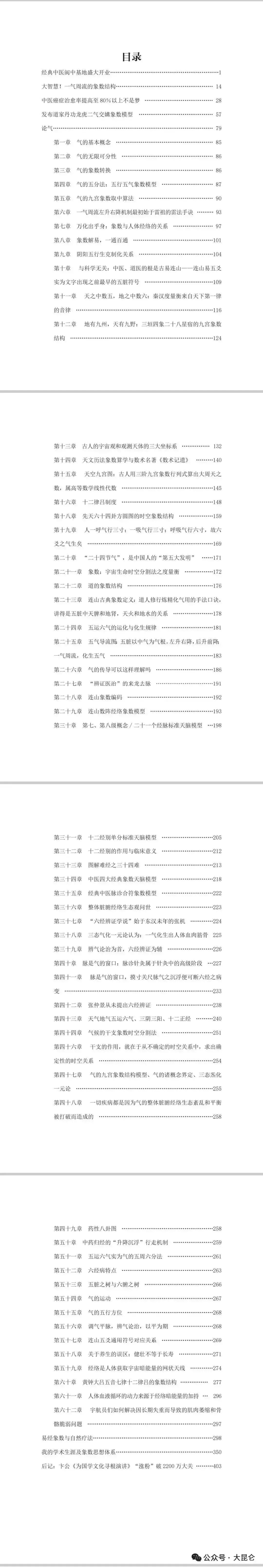 OCR:IMG:第五十六章调气平脉,辨气论治,以平为期……268 第五十七章连山五交通用符号对应关系… *.....269 第五十八章关于养生的误区:健壮不等于长寿 第五十九章经络是人体获取宇宙暗能量的网状天线 ..274 第六十章黄钟大吕五音七律十二律吕的象数结构 277 第六十一章人体血液循环的动力来源于经络暗能量的加持296 第六十二章宇航员们如何解决因长期失重而导致的肌肉菱缩和骨 骼脆弱问题 +.......... 易经象数与自然疗法 我的学术生涯及象数思想体系 后记:卞公《为国学文化寻根演讲》“涨粉”破2200万大关403 公众号·大昆仑