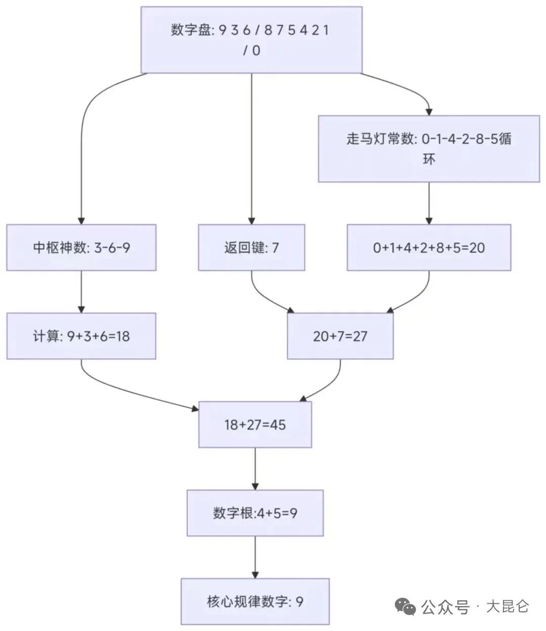 OCR:IMG:数字盘:936/875421 /0 走马灯常数:0-1-4-2-8-5循 环 中枢神数:3-6-9 返回键:7 0+1+4+2+8+5=20 计算:9+3+6=18 20+7=27 18+27=45 数字根:4+5=9 核心规律数字:9 公众号·大昆仑