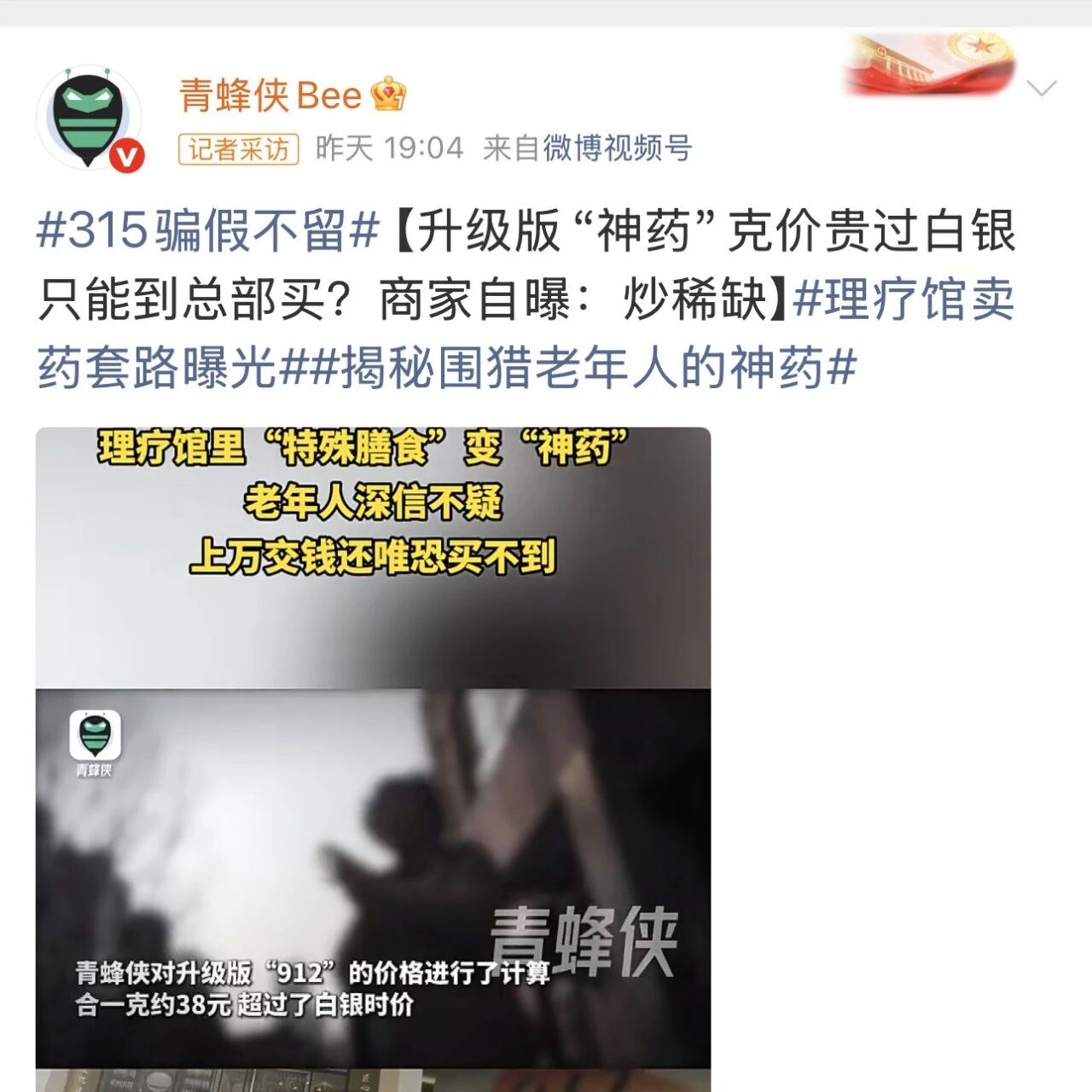 OCR:IMG:06:18 ! 5G 96 青蜂侠Bee 精选 微博 ? 视频 1万次观看 00:51 3 85 169 青蜂侠Bee 记者采访 昨天19:04来自微博视频号 #315骗假不留#【升级版“神药”克价贵过白银 只能到总部买?商家自曝:炒稀缺】#理疗馆卖 药套路曝光##揭秘围猎老年人的神药# 理疗馆里“特殊膳食”变“神药” 老年人深信不疑 上万交钱还唯恐买不到 清鲜庆 嘉蜂侠 青蜂侠对升级版“912”的价格进行了计算 合一克约38元超过了白银时价 克价贵过白银 关于石洲吴老 “神药” 理疗馆里的 百着丰厚富饶的中医药资源 绵延不绝。 与古 载着源远流长的中医药 书 国医大 +关注 这里更传场 花 友善评论,文明发言 V +关注 助威 私信 通知 推荐