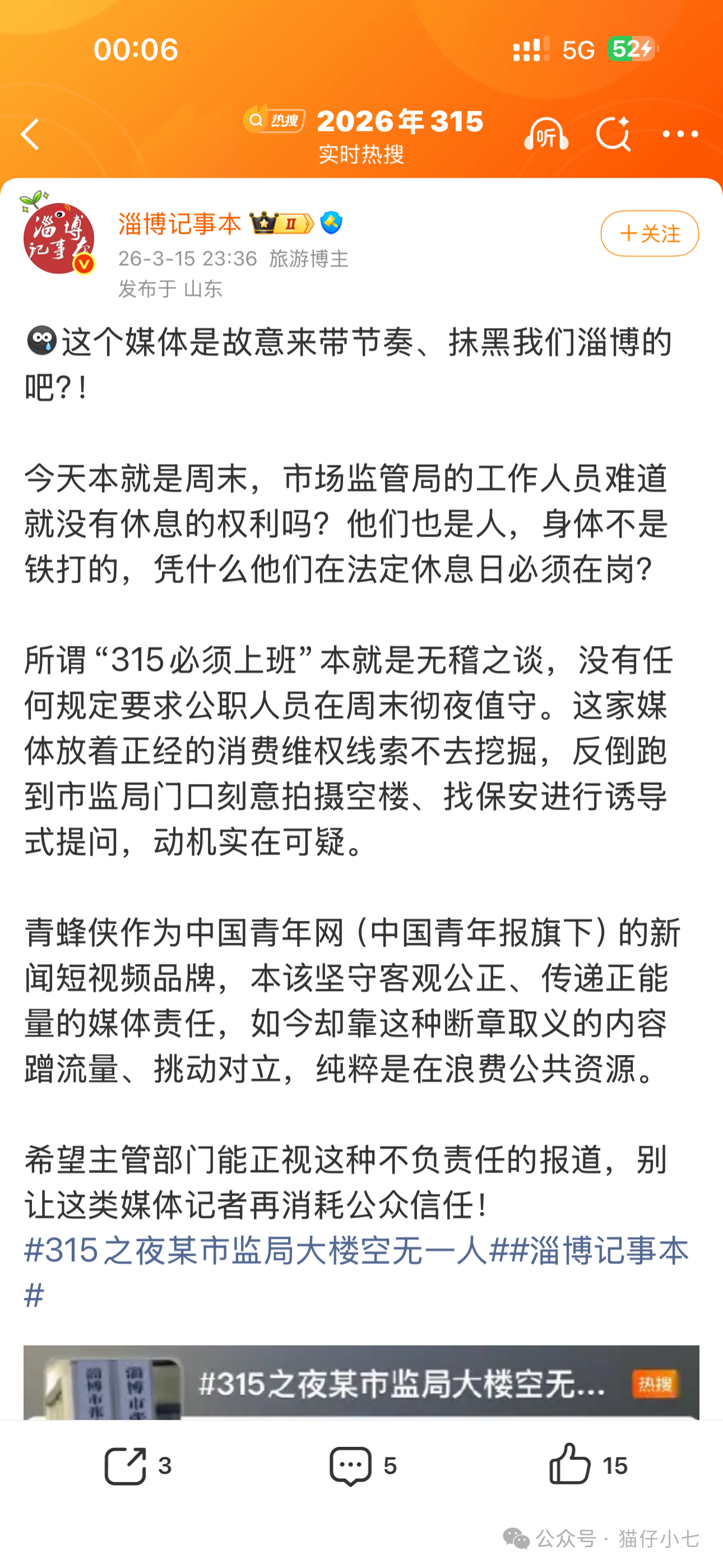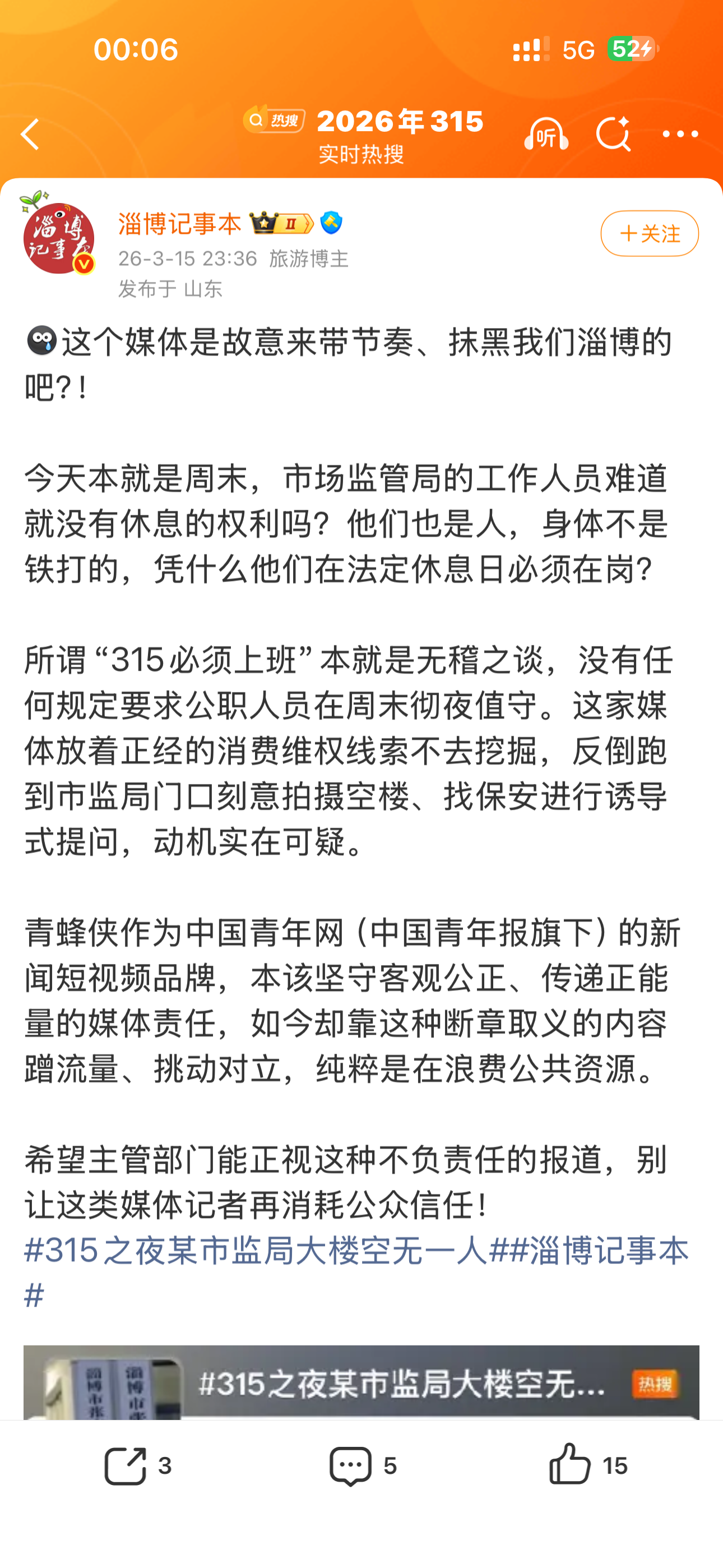 OCR:IMG:00:06 !! 5G 524 Q热瘦 2026年315 听 实时热搜 淄博记事本 十关注 記事 26-3-1523:36旅游博主 发布于山东 ?这个媒体是故意来带节奏、抹黑我们淄博的 吧?! 今天本就是周末,市场监管局的工作人员难道 就没有休息的权利吗?他们也是人,身体不是 铁打的,凭什么他们在法定休息日必须在岗? 所谓“315必须上班”本就是无稽之谈,没有任 何规定要求公职人员在周未彻夜值守。这家媒 体放着正经的消费维权线索不去挖掘,反倒跑 到市监局门口刻意拍摄空楼、找保安进行诱导 式提问,动机实在可疑。 青蜂侠作为中国青年网(中国青年报旗下)的新 闻短视频品牌,本该坚守客观公正、传递正能 量的媒体责任,如今却靠这种断章取义的内容 蹭流量、挑动对立,纯粹是在浪费公共资源。 希望主管部门能正视这种不负责任的报道,别 让这类媒体记者再消耗公众信任! #315之夜某市监局大楼空无一人##淄博记事本 # 宝 福 博 #315之夜某市监局大楼空无. 热搜 山 中 1 15 公众号·猫仔小七
