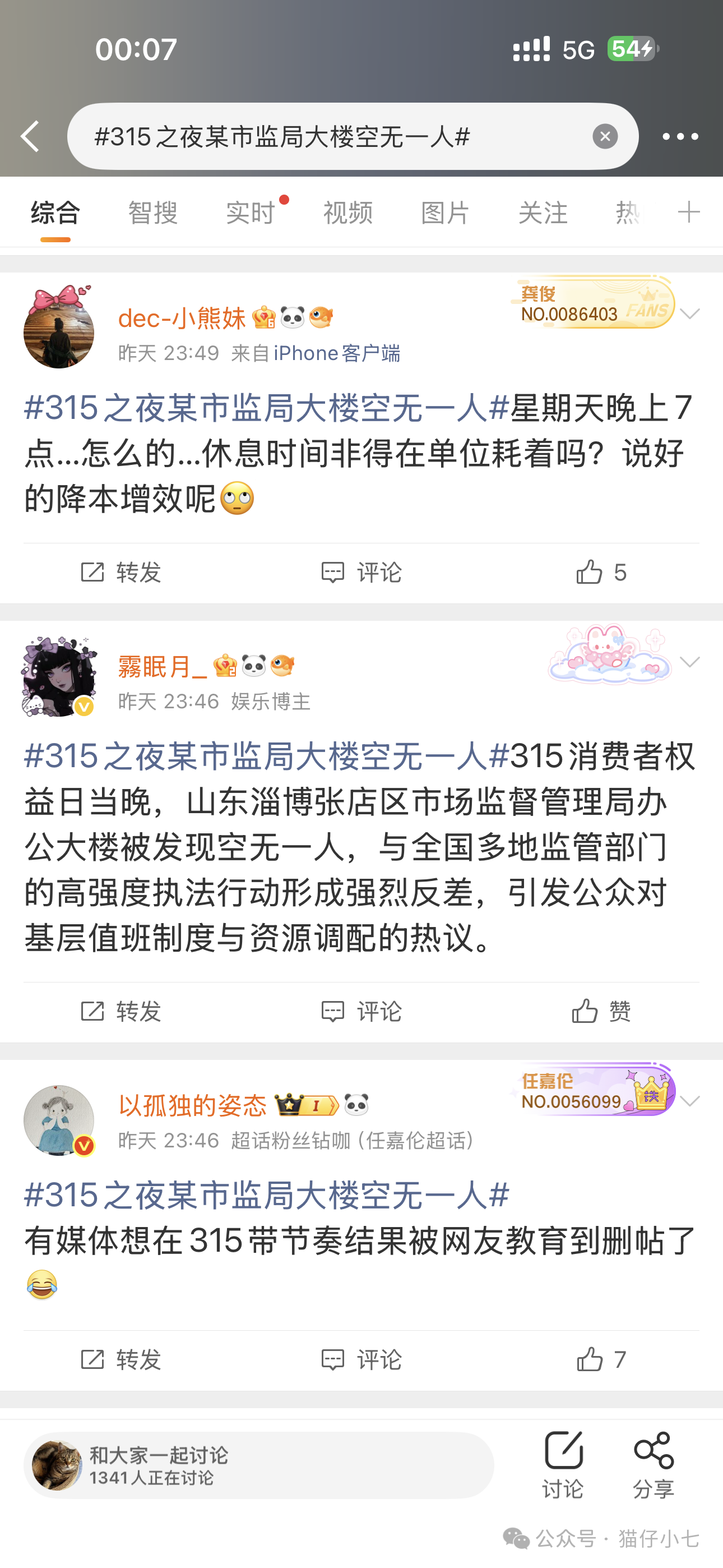 OCR:IMG:00:07 !!5G 544 #315之夜某市监局大楼空无一人# 综合 智搜 实时 号 视频 图片 关注 热 十 龚俊 dec-小熊妹 NO.0086403 FANS 昨天23:49来自iPhone客户端 #315之夜某市监局大楼空无一人#星期天晚上7 点..怎么的...休息时间非得在单位耗着吗?说好 的降本增效呢( 转发 评论 5 雾眠月_ 昨天23:46娱乐博主 #315之夜某市监局大楼空无一人#315消费者权 益日当晚,山东淄博张店区市场监督管理局办 公大楼被发现空无一人,与全国多地监管部门 的高强度执法行动形成强烈反差,引发公众对 基层值班制度与资源调配的热议。 转发 评论 赞 任嘉伦 以孤独的姿态 NO.0056099 铁 昨天23:46超话粉丝钻咖(任嘉伦超话) #315之夜某市监局大楼空无一人# 有媒体想在315带节奏结果被网友教育到删帖了 转发 评论 7 C 和大家一起讨论 1341人正在讨论 讨论 分享 公众号·猫仔小七