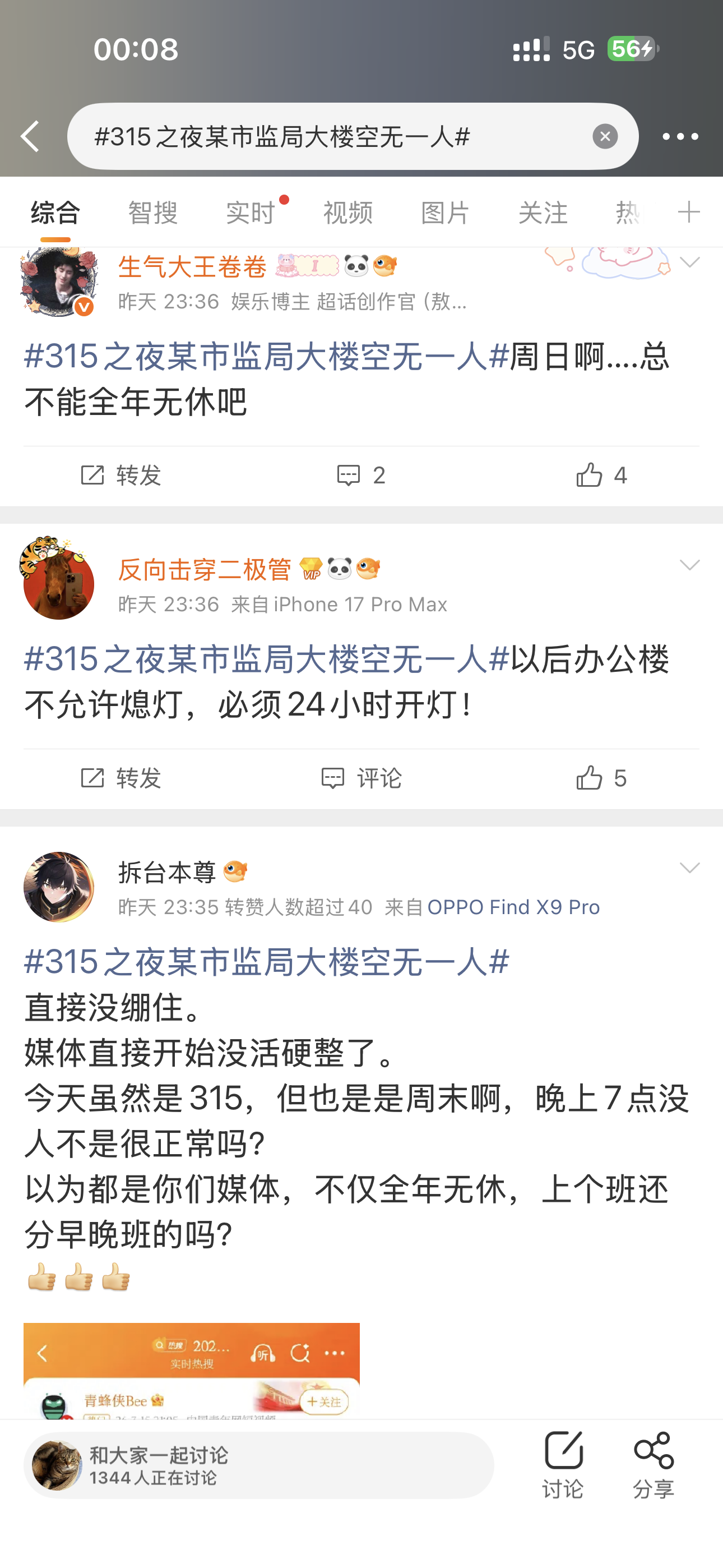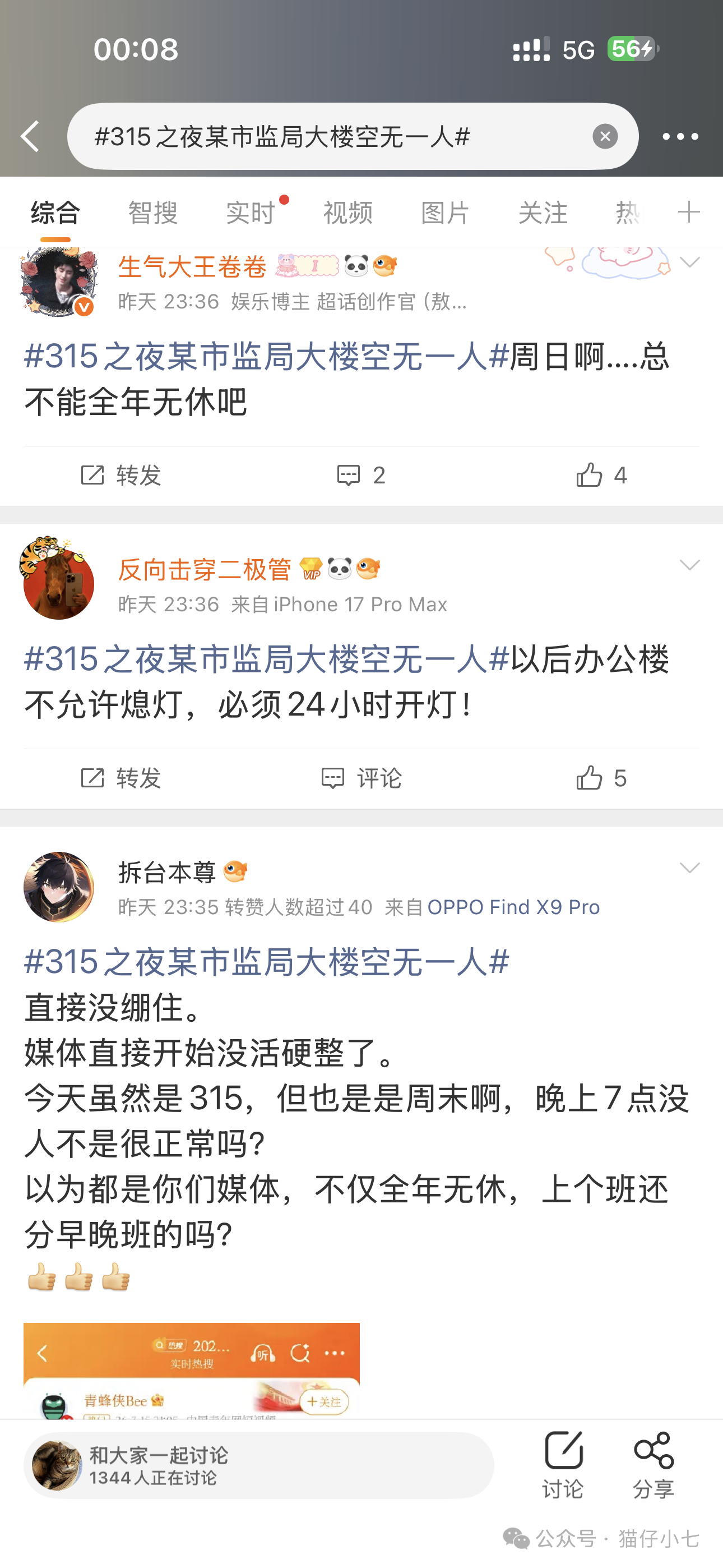 OCR:IMG:00:08 !!5G 564 #315之夜某市监局大楼空无一人# 综合 智搜 实时 ? 视频 图片 关注 热 十 生气大王卷卷 昨天23:36娱乐博主超话创作官(敖.. #315之夜某市监局大楼空无一人#周日啊....总 不能全年无休吧 转发 2 凸4 反向击穿二极管 昨天23:36来自iPhone17ProMax #315之夜某市监局大楼空无一人#以后办公楼 不允许熄灯,必须24小时开灯! 转发 评论 5 拆台本尊 昨天23:35转赞人数超过40来自OPPOFindX9Pro #315之夜某市监局大楼空无一人# 直接没绷住。 媒体直接开始没活硬整了。 今天虽然是315,但也是是周末啊,晚上7点没 人不是很正常吗? 以为都是你们媒体,不仅全年无休,上个班还 分早晚班的吗? 202. 听 实时热搜 青蜂侠Bee 十关注 和大家一起讨论 1344人正在讨论 讨论 分享 公众号·猫仔小七