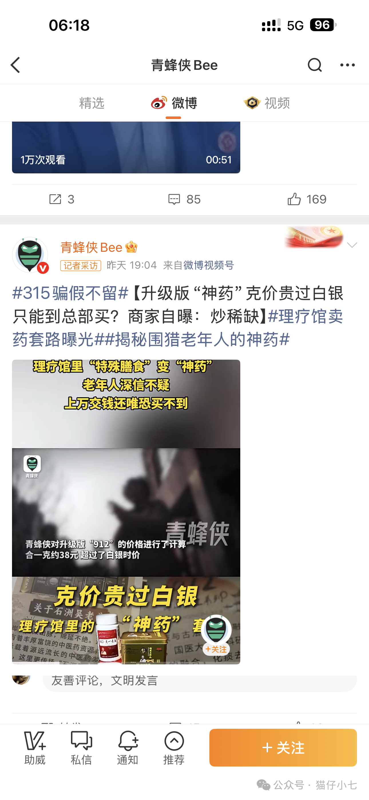 OCR:IMG:06:18 :!!!5G 96 青蜂侠Bee 精选 微博 ? 视频 ? 1万次观看 00:51 3 85 169 青蜂侠Bee 记者采访 昨天19:04来自微博视频号 #315骗假不留#【升级版“神药”克价贵过白银 只能到总部买?商家自曝:炒稀缺】#理疗馆卖 药套路曝光##揭秘围猎老年人的神药# 理疗馆里“特殊膳食”变“神药” 老年人深信不疑 上万交钱还唯恐买不到 清鲜庆 嘉蜂侠 青蜂侠对升级版“912”的价格进行了计算 合一克约38元超过了白银时价 克价贵过白银 关于石洲吴老 “神药” 理疗馆里的 百着丰厚富饶的中医药资源 绵延不绝。 与古 载着源远流长的中医药 书 国医大 +关注 花 友善评论,文明发言 V +关注 助威 私信 通知 推荐 公众号·猫仔小七