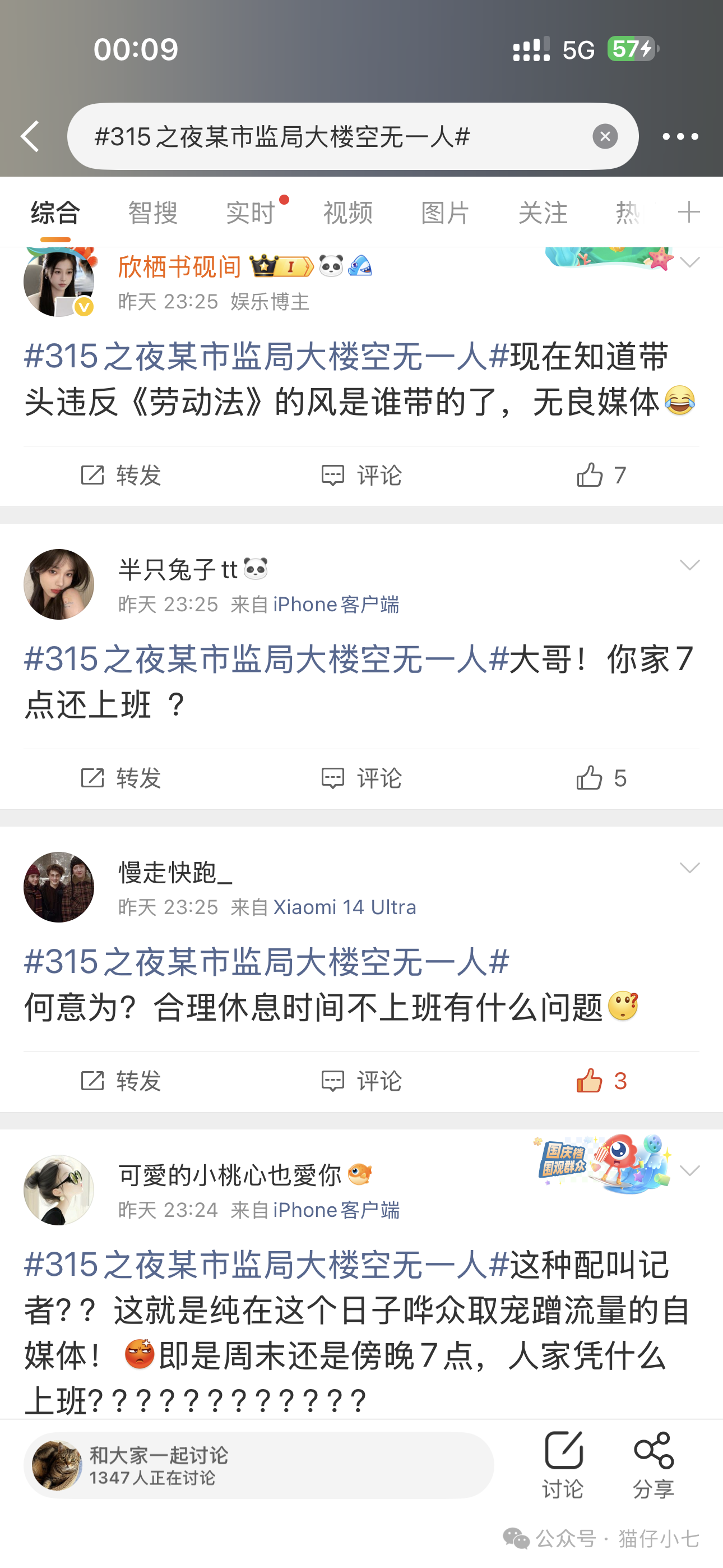 OCR:IMG:00:09 !!.5G 57 #315之夜某市监局大楼空无一人# 综合 智搜 实时 视频 图片 关注 热 十 欣栖书砚间 昨天23:25娱乐博主 #315之夜某市监局大楼空无一人#现在知道带 头违反《劳动法》的风是谁带的了,无良媒体 转发 评论 7 半只兔子tt 昨天23:25来自iPhone客户端 #315之夜某市监局大楼空无一人#大哥!你家7 点还上班? 转发 评论 5 慢走快跑_ 昨天23:25来自Xiaomi14Ultra #315之夜某市监局大楼空无一人# 何意为?合理休息时间不上班有什么问题 转发 评论 3 国庆档 可愛的小桃心也愛你 围观群众 昨天23:24来自iPhone客户端 #315之夜某市监局大楼空无一人#这种配叫记 者??这就是纯在这个日子哗众取宠蹭流量的自 媒体! 即是周末还是傍晚7点,人家凭什么 上班???????????? 和大家一起讨论 7 1347人正在讨论 讨论 分享 公众号·猫仔小七