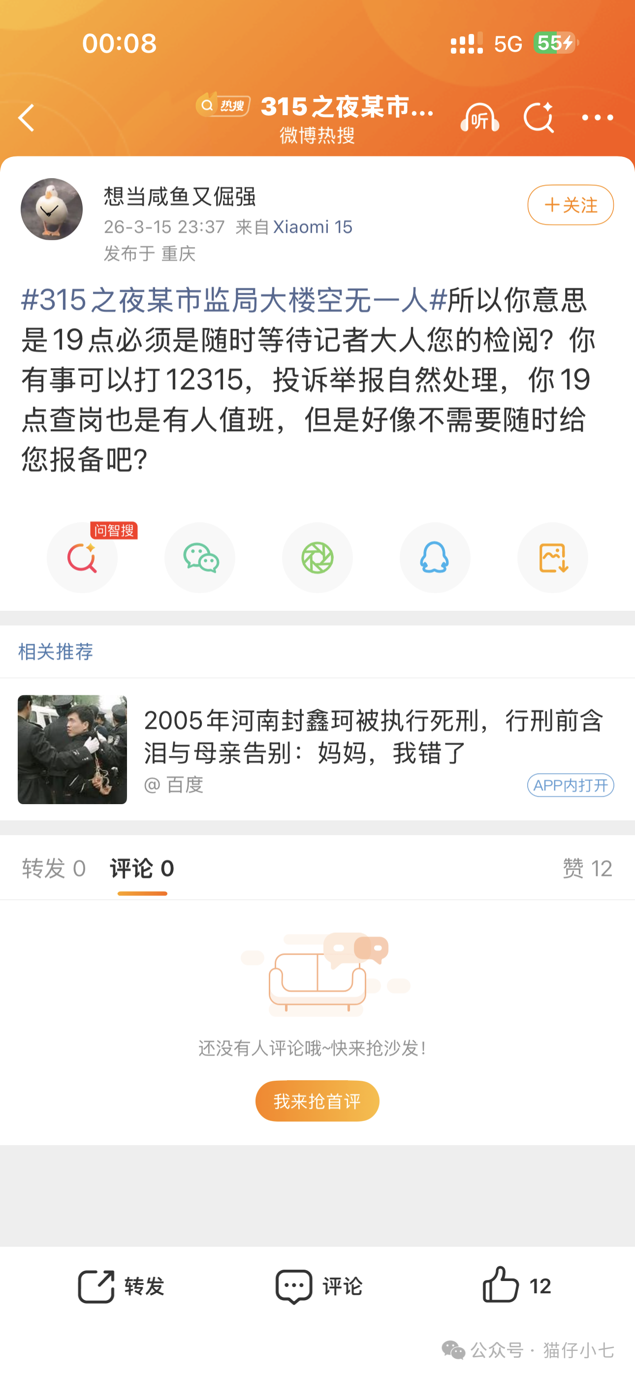 OCR:IMG:00:08 !5G 554 315之夜某市... Q热瘦 听 微博热搜 想当咸鱼又倔强 十关注 26-3-1523:37来自Xia0mi15 发布于重庆 #315之夜某市监局大楼空无一人#所以你意思 是19点必须是随时等待记者大人您的检阅?你 有事可以打12315,投诉举报自然处理,你19 点查岗也是有人值班,但是好像不需要随时给 您报备吧? 问智搜 M 相关推荐 2005年河南封鑫珂被执行死刑,行刑前含 泪与母亲告别:妈妈,我错了 @百度 APP内打开 转发0 评论0 赞12 还没有人评论哦~快来抢沙发! 我来抢首评 转发 评论 12