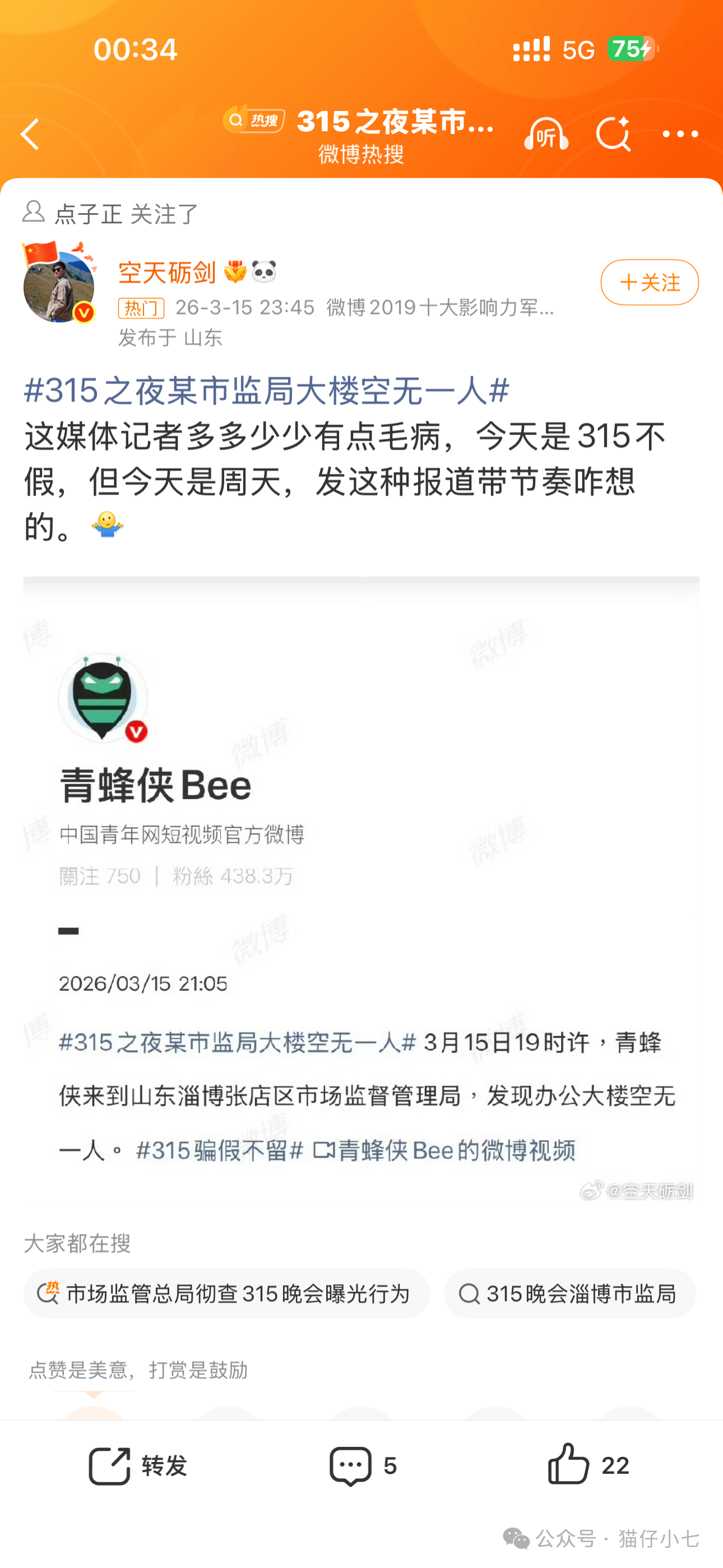 OCR:IMG:00:34 :!!5G 75 Q热瘦 315之夜某市... 听 微博热搜 8点子正关注了 空天砺剑 十关注 热门26-3-1523:45微博2019十大影响力军. 发布于山东 #315之夜某市监局大楼空无一人# 这媒体记者多多少少有点毛病,今天是315不 假,但今天是周天,发这种报道带节奏咋想 的。 青蜂侠Bee 中国青年网短视频官方微博 注750粉絲438.3万 2026/03/1521:05 #315之夜某市监局大楼空无一人#3月15日19时许,青蜂 侠来到山东淄博张店区市场监督管理局,发现办公大楼空无 一人。#315骗假不留#口青蜂侠Bee的微博视频 6@空天砺剑 大家都在搜 市场监管总局彻查315晚会曝光行为 Q315晚会淄博市监局 点赞是美意,打赏是鼓励 转发 22 公众号·猫仔小七