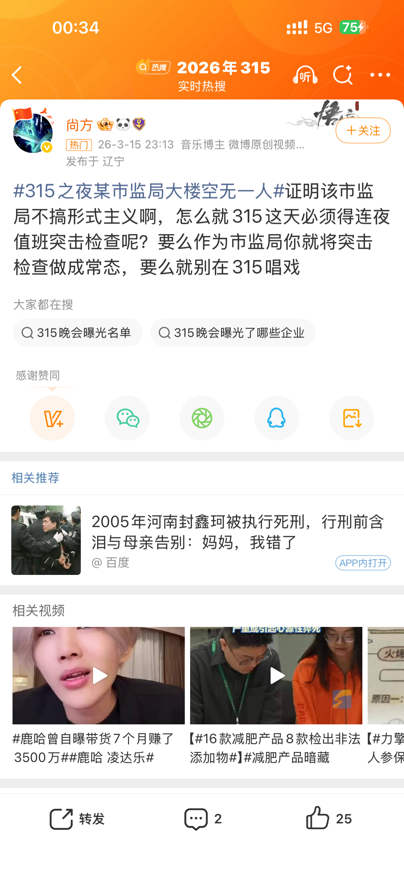 OCR:IMG:00:34 :!!5G 75+ Q热搜 2026年315 听 实时热搜 尚方 qe 十关注 热门26-3-1523:13音乐博主微博原创视频.. 发布于辽宁 #315之夜某市监局大楼空无一人#证明该市监 局不搞形式主义啊,怎么就315这天必须得连夜 值班突击检查呢?要么作为市监局你就将突击 检查做成常态,要么就别在315唱戏 大家都在搜 Q315晚会曝光名单 Q315晚会曝光了哪些企业 感谢赞同 V 网 相关推荐 2005年河南封鑫珂被执行死刑,行刑前含 泪与母亲告别:妈妈,我错了 @百度 APP内打开 相关视频 火爆 原因一 #鹿哈曾自曝带货7个月赚了 【#16款减肥产品8款检出非法【#力擎 3500万##鹿哈凌达乐# 添加物#】#减肥产品暗藏 人参保 转发 25