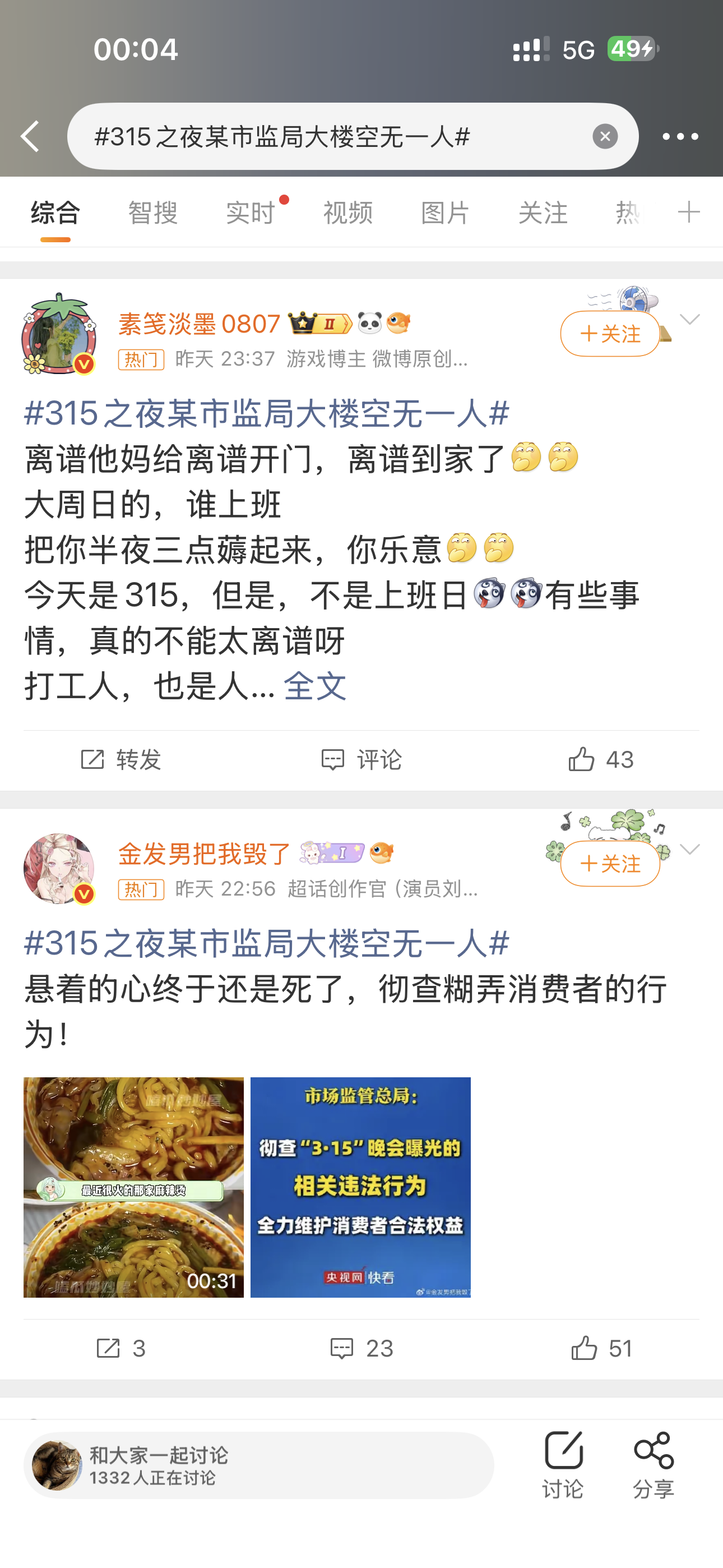 OCR:IMG:00:04 !!5G 494 #315之夜某市监局大楼空无一人# 综合 智搜 实时 视频 图片 关注 热 十 素笺淡墨0807 十关注 热门昨天23:37游戏博主微博原创.. #315之夜某市监局大楼空无一人# 离谱他妈给离谱开门,离谱到家了 大周日的,谁上班 把你半夜三点起来,你乐意 今天是315,但是,不是上班日有些事 情,真的不能太离谱呀 打工人,也是人...全文 转发 评论 凸43 金发男把我毁了 米 十关注 热门昨天22:56超话创作官(演员刘.. #315之夜某市监局大楼空无一人# 悬着的心终于还是死了,彻查糊弄消费者的行 为! 市场监管总局: 彻查“3·15”晚会曝光的 相关违法行为 全力维护消费者合法权益 00:31 央视网快看 3 23 51 和大家一起讨论 7 1332人正在讨论 讨论 分享