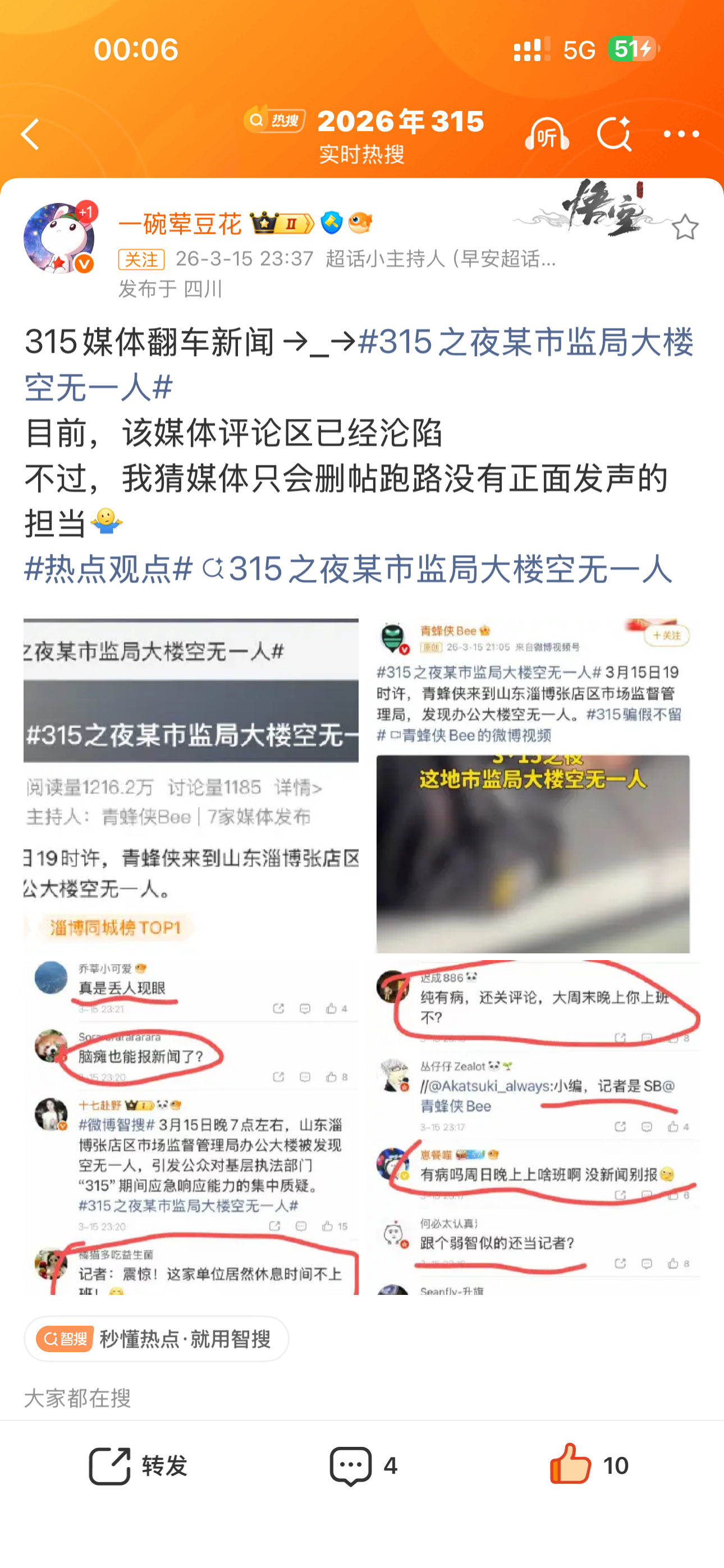 OCR:IMG:00:06 :! 5G 514 Q热瘦 2026年315 实时热搜 一碗荤豆花 关注26-3-1523:37超话小主持人(早安超话.. 发布于四川 315媒体翻车新闻→_→#315之夜某市监局大楼 空无一人# 目前,该媒体评论区已经沦陷 不过,我猜媒体只会删帖跑路没有正面发声的 担当 #热点观点#C315之夜某市监局大楼空无一人 青蜂侠Bee 夜某市监局大楼空无一人# 关注 26-3-1521105采自微博视预号 #315之夜某市监局大楼空无一人#3月15日19 时许,青蜂侠来到山东淄博张店区市场监督管 理局,发现办公大楼空无一人。#315骗假不留 #315之夜某市监局大楼空无 #口青蜂侠Bee的微博视频 15之楼 阅读量1216.2万讨论量1185详情> 这地市监局大楼空无一人 主持人:青蜂侠Bee7家媒体发布 319时许,青蜂侠来到山东淄博张店区 公大楼空无一人。 淄博同城榜TOP1 乔幕小可爱 真是丢人现眼 送成886 纯有病,还关评论,大周末晚上你上班 C4 不? 脑瘫也能报新闻了? 丛仔仔Zealot 8 商 l@Akatsuki_always:小编,记者是SB@ 十七 青蜂侠Bee #微博智搜#3月15日晚7点左右,山东淄 376 23:17 C4 博张店区市场监督管理局办公大楼被发现 空无一人,引发公众对基层执法部门 泡餐 有病吗周日晚上上啥班啊没新闻别报 “315”期间应急响应能力的集中质疑。 #315之夜某市监局大楼空无一人# 3-523:20 艺 日 15 何必太认真 跟个弱智似的还当记者? 猫多吃益生菌 记者:震惊!这家单位居然休息时间不上 8 II 1 正 Seanflv-升超 C智搜 秒懂热点·就用智搜 大家都在搜 转发 10 公众号·猫仔小七
