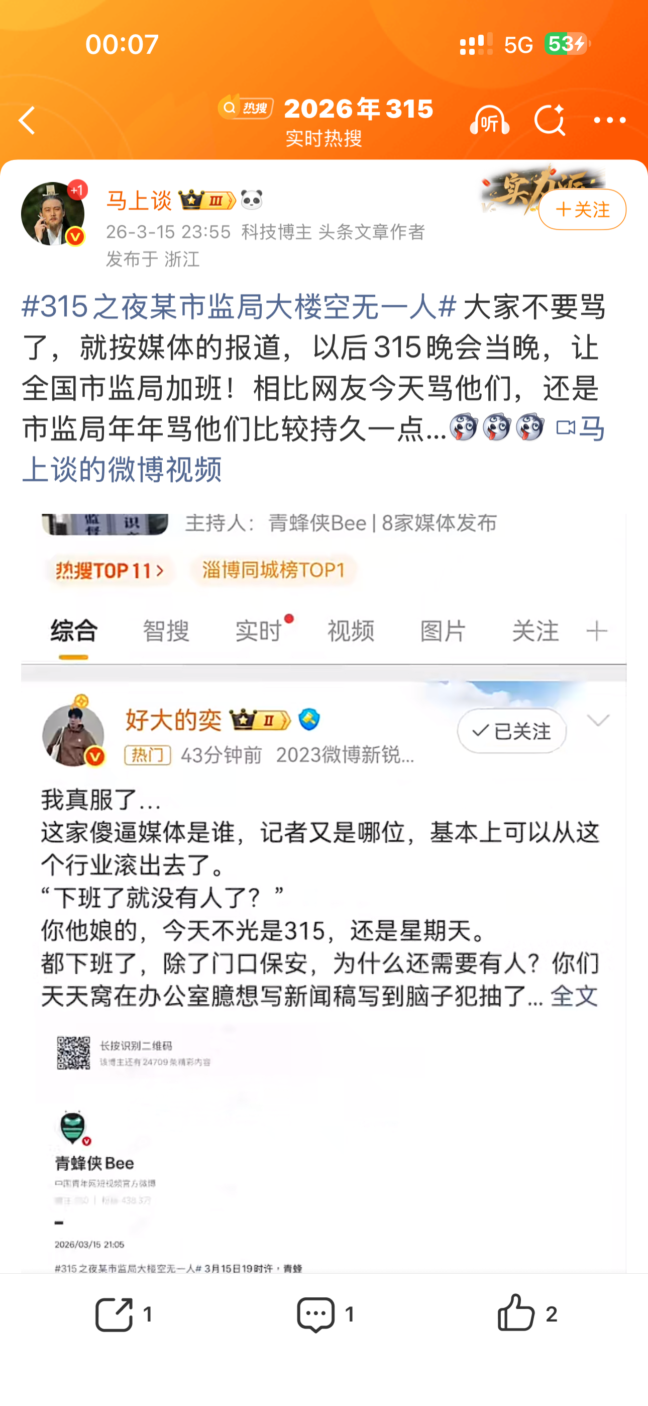 OCR:IMG:00:07 :5G 534 Q热搜 2026年315 听 实时热搜 实力证 马上谈m 8 +关注 26-3-1523:55科技博主头条文章作者 发布于浙江 #315之夜某市监局大楼空无一人#大家不要骂 了,就按媒体的报道,以后315晚会当晚,让 全国市监局加班!相比网友今天骂他们,还是 市监局年年骂他们比较持久一点..马 上谈的微博视频 识 主持人:青蜂侠Bee|8家媒体发布 热搜T0P11> 淄博同城榜TOP1 综合 智搜 实时 视频 图片 关注 好大的奕 I √已关注 [热门43分钟前2023微博新锐.. 我真服了... 这家傻逼媒体是谁,记者又是哪位,基本上可以从这 个行业滚出去了。 “下班了就没有人了? 你他娘的,今天不光是315,还是星期天。 都下班了,除了门口保安,为什么还需要有人?你们 天天窝在办公室臆想写新闻稿写到脑子犯抽了..全文 长按识别二维码 该博主还有24709荣福彩内容 青蜂侠Bee 口国青年民冠视频官万得 生 1 2026/03/15 21;05 #315之夜某市监局大楼空无一人#3月15日19时许青蜂