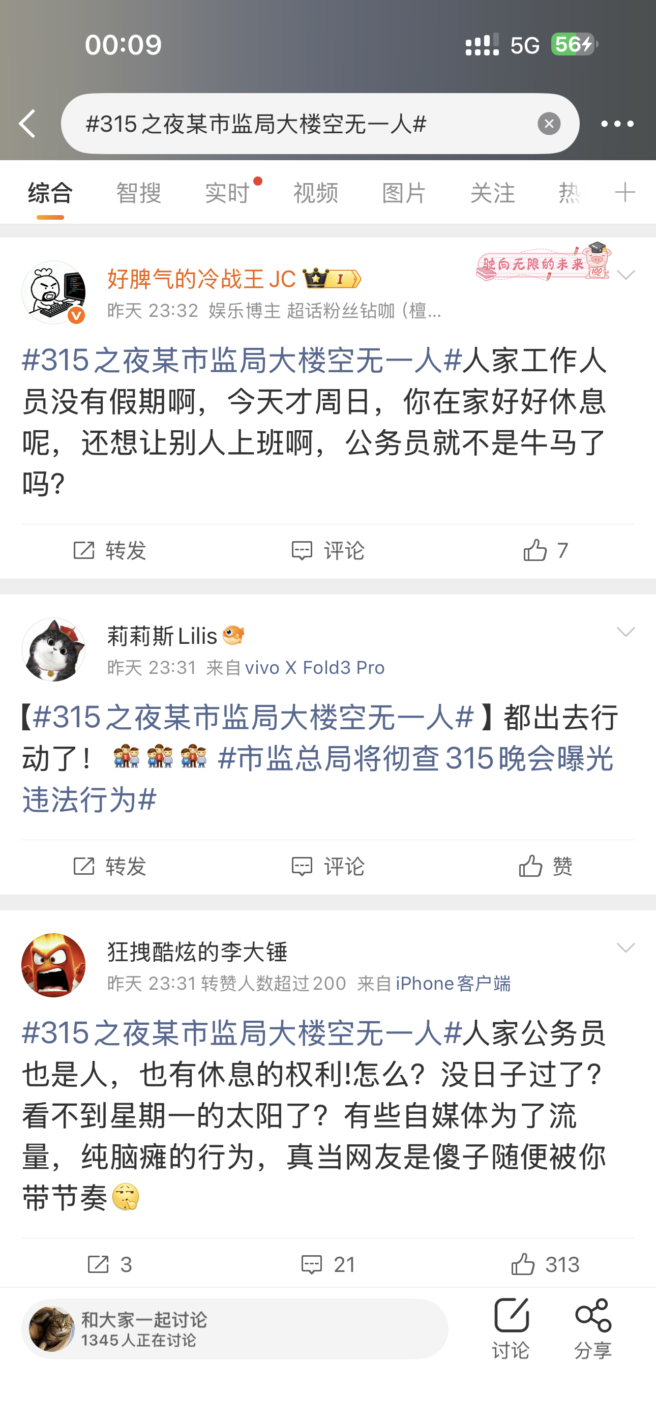 OCR:IMG:00:09 !!5G 564 #315之夜某市监局大楼空无一人# 综合 智搜 实时 视频 图片 关注 热 十 驶向无限的未来 好脾气的冷战王JC 2 昨天23:32娱乐博主超话粉丝钻咖(檀.. #315之夜某市监局大楼空无一人#人家工作人 员没有假期啊,今天才周日,你在家好好休息 呢,还想让别人上班啊,公务员就不是牛马了 吗? 转发 评论 7 莉莉斯Lilis ? 昨天23:31来自vivoXFold3Pro 【#315之夜某市监局大楼空无一人#】都出去行 动了! #市监总局将彻查315晚会曝光 违法行为# 转发 评论 赞 狂拽酷炫的李大锤 昨天23:31转赞人数超过200来自iPhone客户端 #315之夜某市监局大楼空无一人#人家公务员 也是人,也有休息的权利!怎么?没日子过了? 看不到星期一的太阳了?有些自媒体为了流 量,纯脑瘫的行为,真当网友是傻子随便被你 带节奏 3 21 313 C 和大家一起讨论 1345人正在讨论 讨论 分享 公众号·猫仔小七