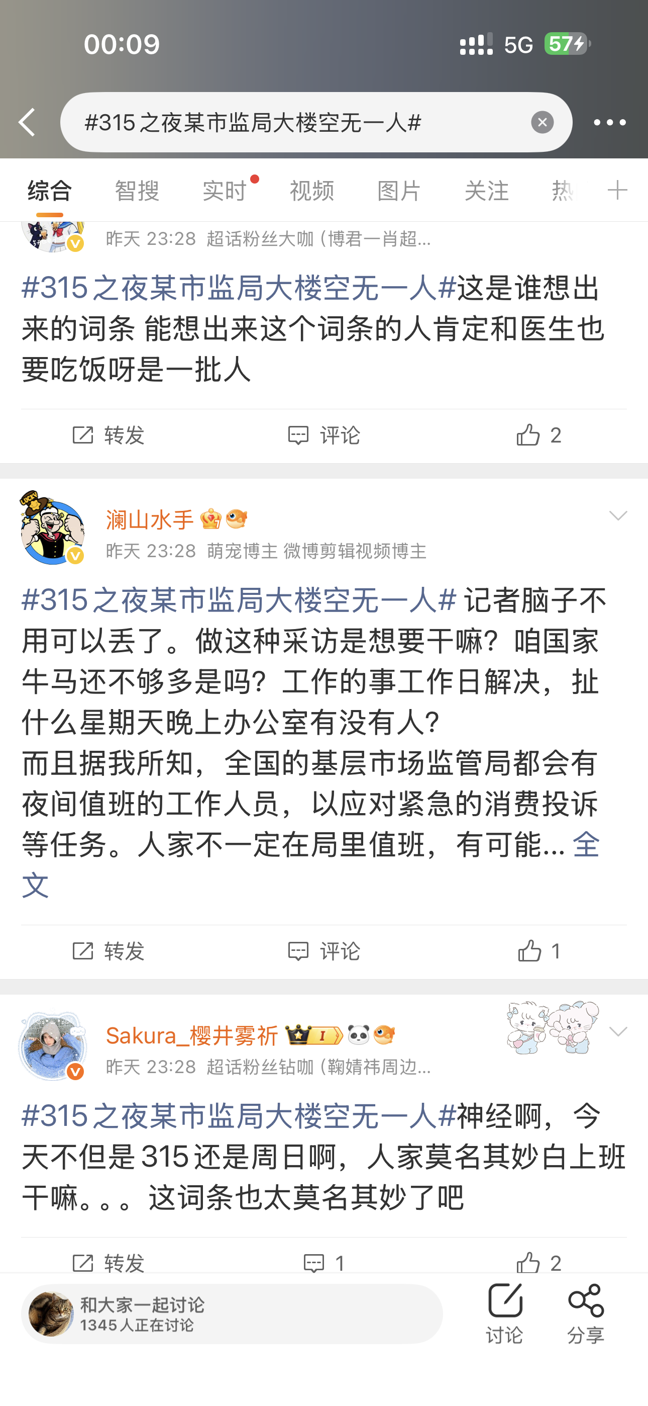 OCR:IMG:00:09 :!!.5G 57 #315之夜某市监局大楼空无一人# 综合 智搜 实时 ? 视频 图片 关注 热 十 昨天23:28超话粉丝大咖(博君一肖超. #315之夜某市监局大楼空无一人#这是谁想出 来的词条能想出来这个词条的人肯定和医生也 要吃饭呀是一批人 转发 评论 2 澜山水手 昨天23:28萌宠博主微博剪辑视频博主 #315之夜某市监局大楼空无一人#记者脑子不 用可以丢了。做这种采访是想要干嘛?咱国家 牛马还不够多是吗?工作的事工作日解决,扯 什么星期天晚上办公室有没有人? 而且据我所知,全国的基层市场监管局都会有 夜间值班的工作人员,以应对紧急的消费投诉 等任务。人家不一定在局里值班,有可能..全 文 转发 评论 凸1 Sakura_樱井雾祈 昨天23:28超话粉丝钻咖(鞠婧祎周边.. #315之夜某市监局大楼空无一人#神经啊,今 天不但是315还是周日啊,人家莫名其妙白上班 干嘛。。。这词条也太莫名其妙了吧 转发 1 和大家一起讨论 1345人正在讨论 讨论 分享