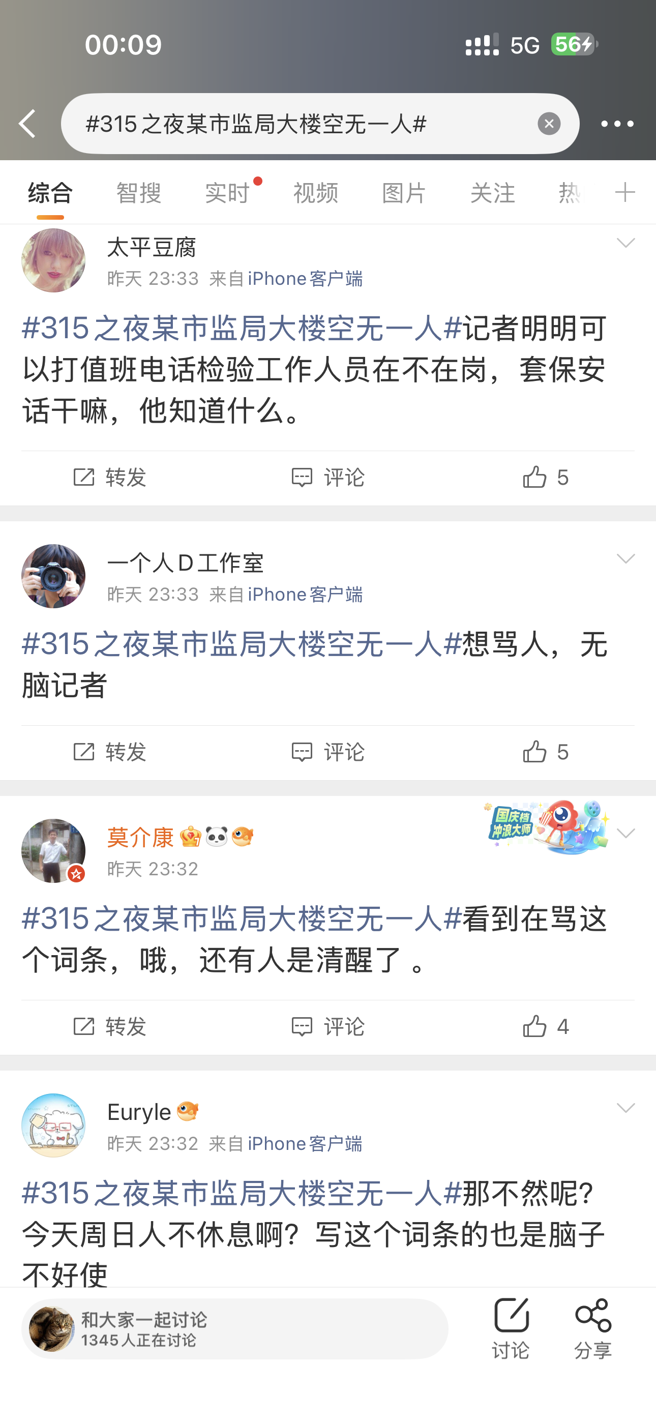 OCR:IMG:00:09 !!5G 564 #315之夜某市监局大楼空无一人# 综合 智搜 实时 ? 视频 图片 关注 热 十 太平豆腐 昨天23:33来自iPhone客户端 #315之夜某市监局大楼空无一人#记者明明可 以打值班电话检验工作人员在不在岗,套保安 话干嘛,他知道什么。 转发 评论 5 一个人D工作室 昨天23:33来自iPhone客户端 #315之夜某市监局大楼空无一人#想骂人,无 脑记者 转发 评论 5 国庆档 莫介康 冲浪大师 昨天23:32 号 #315之夜某市监局大楼空无一人#看到在骂这 个词条,哦,还有人是清醒了。 转发 评论 4 Euryle PG 昨天23:32来自iPhone客户端 #315之夜某市监局大楼空无一人#那不然呢? 今天周日人不休息啊?写这个词条的也是脑子 不好使 C 和大家一起讨论 . 1345人正在讨论 讨论 分享