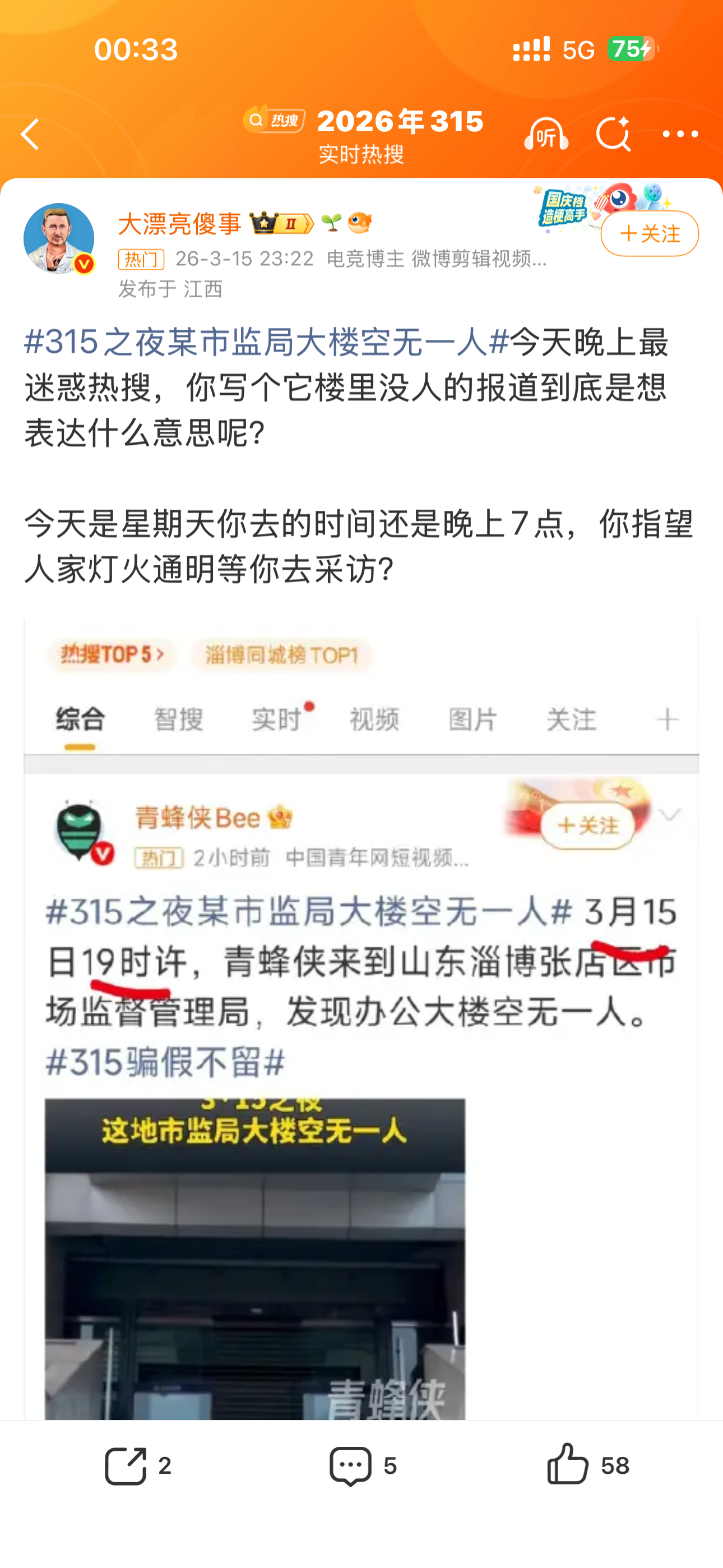 OCR:IMG:00:33 :!!!5G 754 Q热瘦 2026年315 听 实时热搜 国庆档 大漂亮傻事 ? 造梗高手 十关注 热门26-3-1523:22电竞博主微博剪辑视频.. 发布于江西 #315之夜某市监局大楼空无一人#今天晚上最 迷惑热搜,你写个它楼里没人的报道到底是想 表达什么意思呢? 今天是星期天你去的时间还是晚上7点,你指望 人家灯火通明等你去采访? 热搜TOP5> 淄博同城榜TOP1 综合 智搜 实时 视频 图片 关注 青蜂侠Bee 十关注 热门2小时前中国青年网短视频. #315之夜某市监局大楼空无一人#3月15 日19时许,青蜂侠来到山东淄博张店区市 场监督管理局,发现办公大楼空无一人。 #315骗假不留# 这地市监局大楼空无一人 58