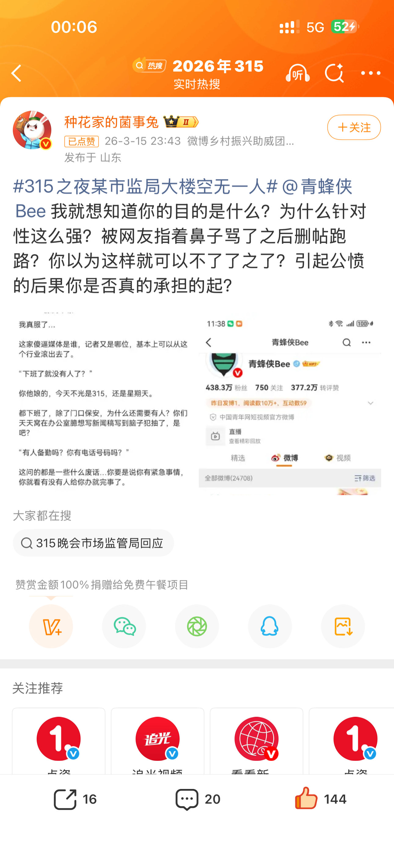OCR:IMG:00:06 ! 5G 524 Q热瘦 2026年315 听 实时热搜 种花家的菌事兔 十关注 已点赞26-3-1523:43微博乡村振兴助威团... 发布于山东 #315之夜某市监局大楼空无一人#@青蜂侠 Bee我就想知道你的目的是什么?为什么针对 性这么强?被网友指着鼻子骂了之后删帖跑 路?你以为这样就可以不了了之了?引起公愤 的后果你是否真的承担的起? 我真服了... 11:38 100 这家傻逼媒体是谁,记者又是哪位,基本上可以从这 青蜂侠Bee Q 个行业滚出去了。 青蜂侠Bee “下班了就没有人了?” 你他娘的,今天不光是315,还是星期天。 438.3万粉丝 :750关注377.2万转评赞 昨日发博1,阅读数10万+,互动数59 都下班了,除了门口保安,为什么还需要有人?你们 中国青年网短视频官方微博 天天窝在办公室臆想写新闻稿写到脑子犯抽了,是 吧? 回 直播 查看精彩回放 “有人备勤吗?你有电话号码吗? 精选 微博 视频 这问的都是一些什么废话...你要是说你有紧急事情, 你就看有没有人给你办就完事了。 全部微博(24708) 筛选 大家都在搜 Q315晚会市场监管局回应 赞赏金额100%捐赠给免费午餐项目 V+ 关注推荐 追光 4 上次 沪业视题 毛丢虹 上次 C 16 20 144