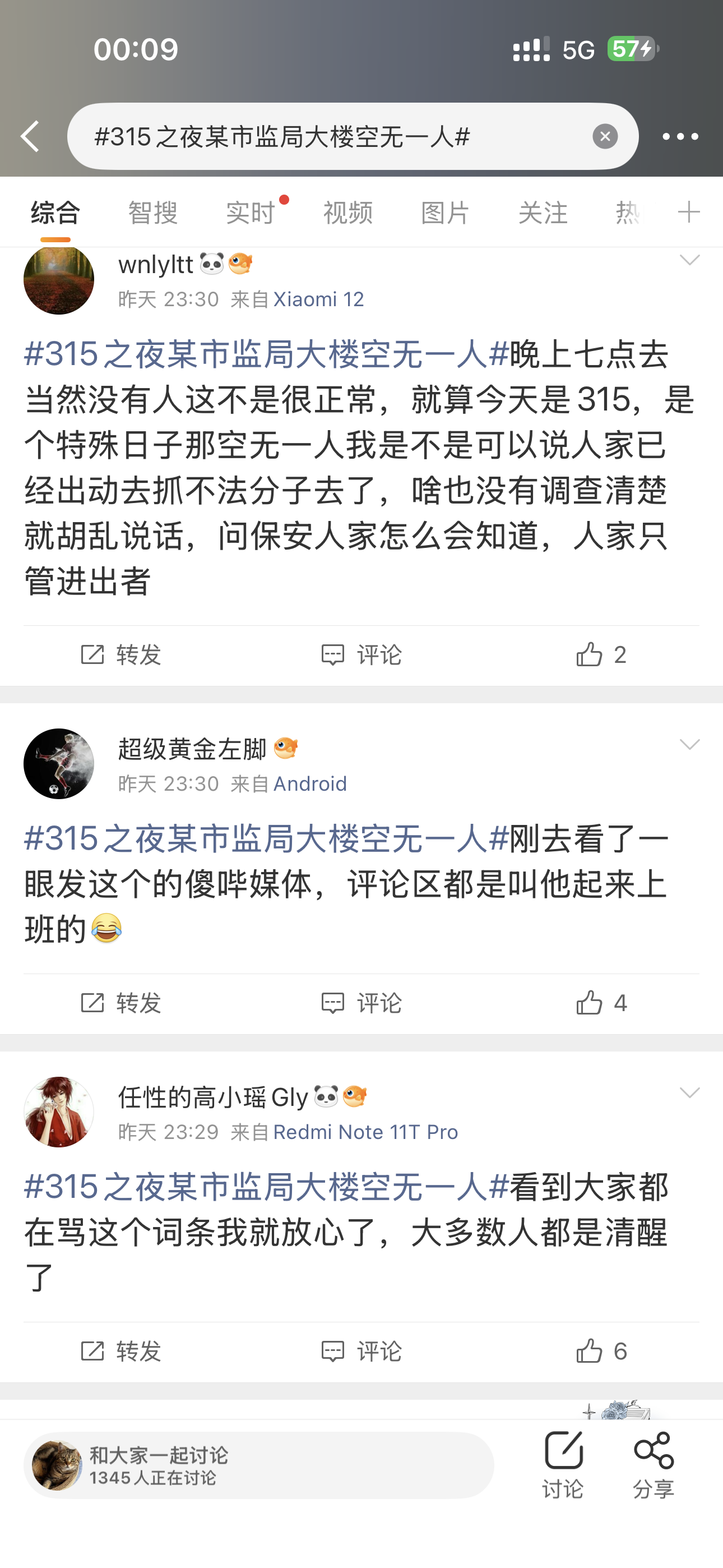 OCR:IMG:00:09 :!!.5G 57 #315之夜某市监局大楼空无一人# 综合 智搜 实时 ? 视频 图片 关注 热 十 wnlyltt 昨天23:30来自Xia0mi12 #315之夜某市监局大楼空无一人#晚上七点去 当然没有人这不是很正常,就算今天是315,是 个特殊日子那空无一人我是不是可以说人家已 经出动去抓不法分子去了,啥也没有调查清楚 就胡乱说话,问保安人家怎么会知道,人家只 管进出者 转发 评论 2 超级黄金左脚 昨天23:30来自Android #315之夜某市监局大楼空无一人#刚去看了一 眼发这个的傻哗媒体,评论区都是叫他起来上 班的 转发 评论 4 任性的高小瑶Gly? 昨天23:29来自RedmiNote11TPro #315之夜某市监局大楼空无一人#看到大家都 在骂这个词条我就放心了,大多数人都是清醒 了 转发 评论 6 和大家一起讨论 C 1345人正在讨论 讨论 分享