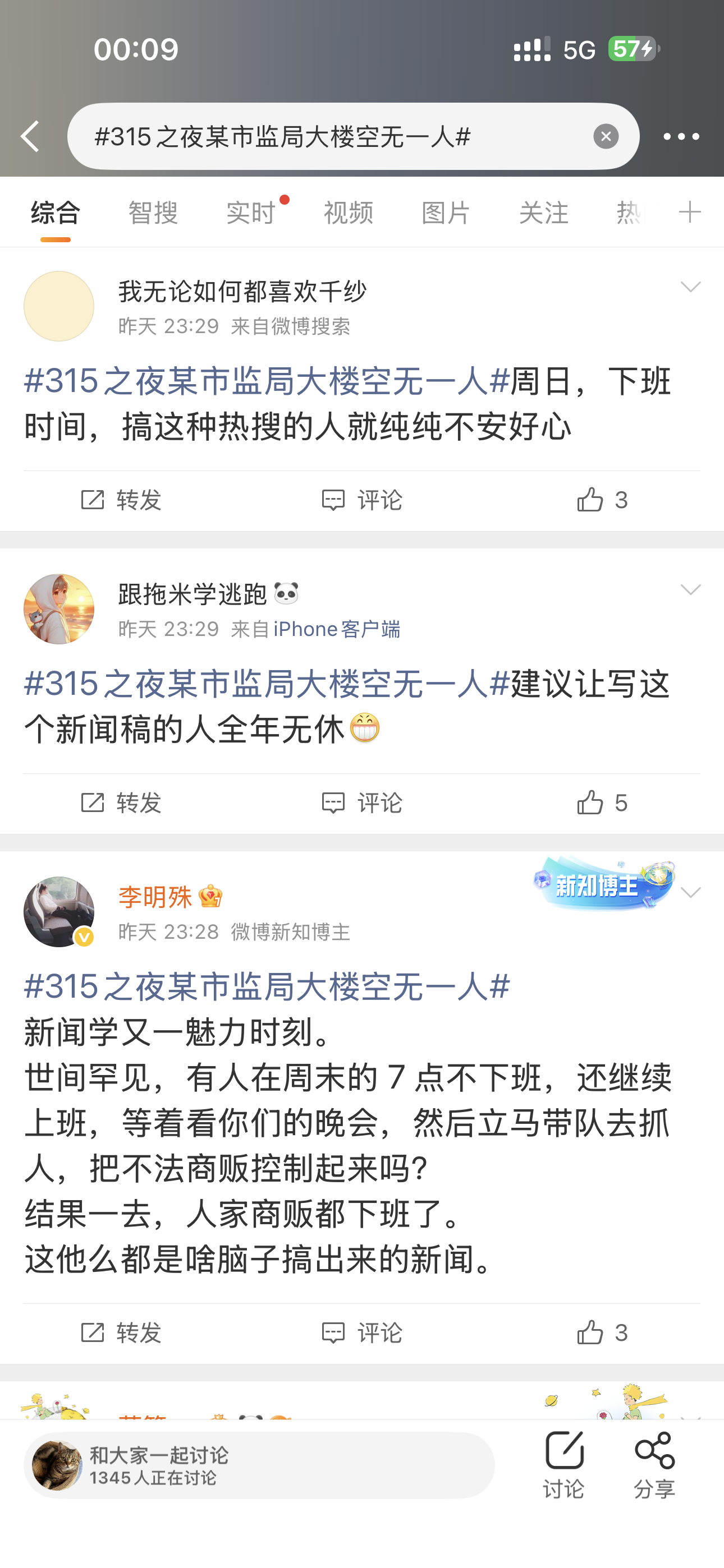 OCR:IMG:00:09 !.5G 57 #315之夜某市监局大楼空无一人# 综合 智搜 实时 ? 视频 图片 关注 热 十 我无论如何都喜欢千纱 昨天23:29来自微博搜索 #315之夜某市监局大楼空无一人#周日,下班 时间,搞这种热搜的人就纯纯不安好心 转发 评论 3 跟拖米学逃跑 昨天23:29来自iPhone客户端 #315之夜某市监局大楼空无一人#建议让写这 个新闻稿的人全年无休 转发 评论 5 新知博主 李明殊 昨天23:28微博新知博主 #315之夜某市监局大楼空无一人# 新闻学又一魅力时刻。 世间罕见,有人在周末的7点不下班,还继续 上班,等着看你们的晚会,然后立马带队去抓 人, 把不法商贩控制起来吗? 结果一去,人家商贩都下班了。 这他么都是啥脑子搞出来的新闻。 转发 评论 3 C 和大家一起讨论 O 1345人正在讨论 讨论 分享