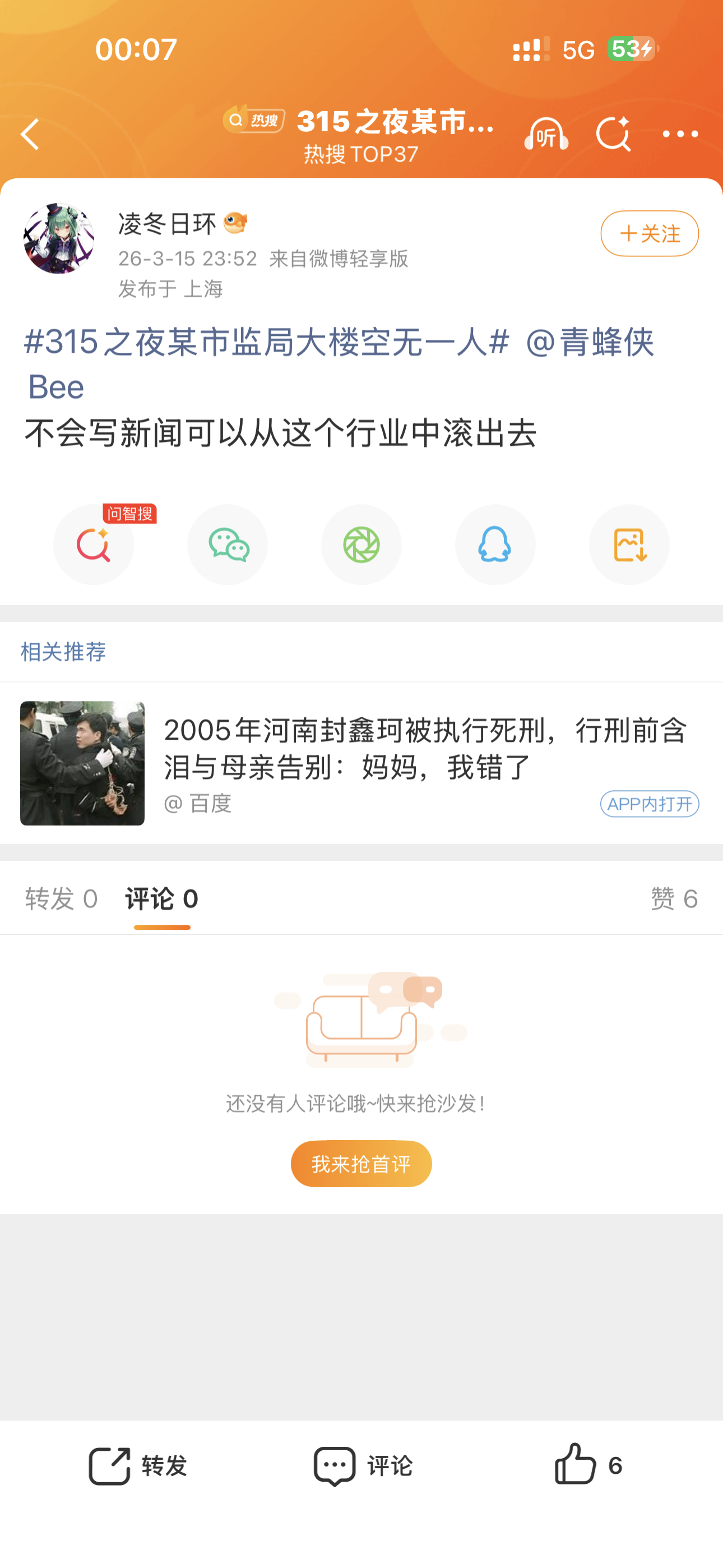 OCR:IMG:00:07 !!5G 534 Q热瘦 315之夜某市.. 热搜TOP37 凌冬日环 十关注 26-3-1523:52来自微博轻享版 发布于上海 #315之夜某市监局大楼空无一人#@青蜂侠 Bee 不会写新闻可以从这个行业中滚出去 问智搜 相关推荐 2005年河南封鑫珂被执行死刑,行刑前含 泪与母亲告别:妈妈,我错了 @百度 APP内打开 转发0 评论0 赞6 还没有人评论哦~快来抢沙发! 我来抢首评 转发 评论