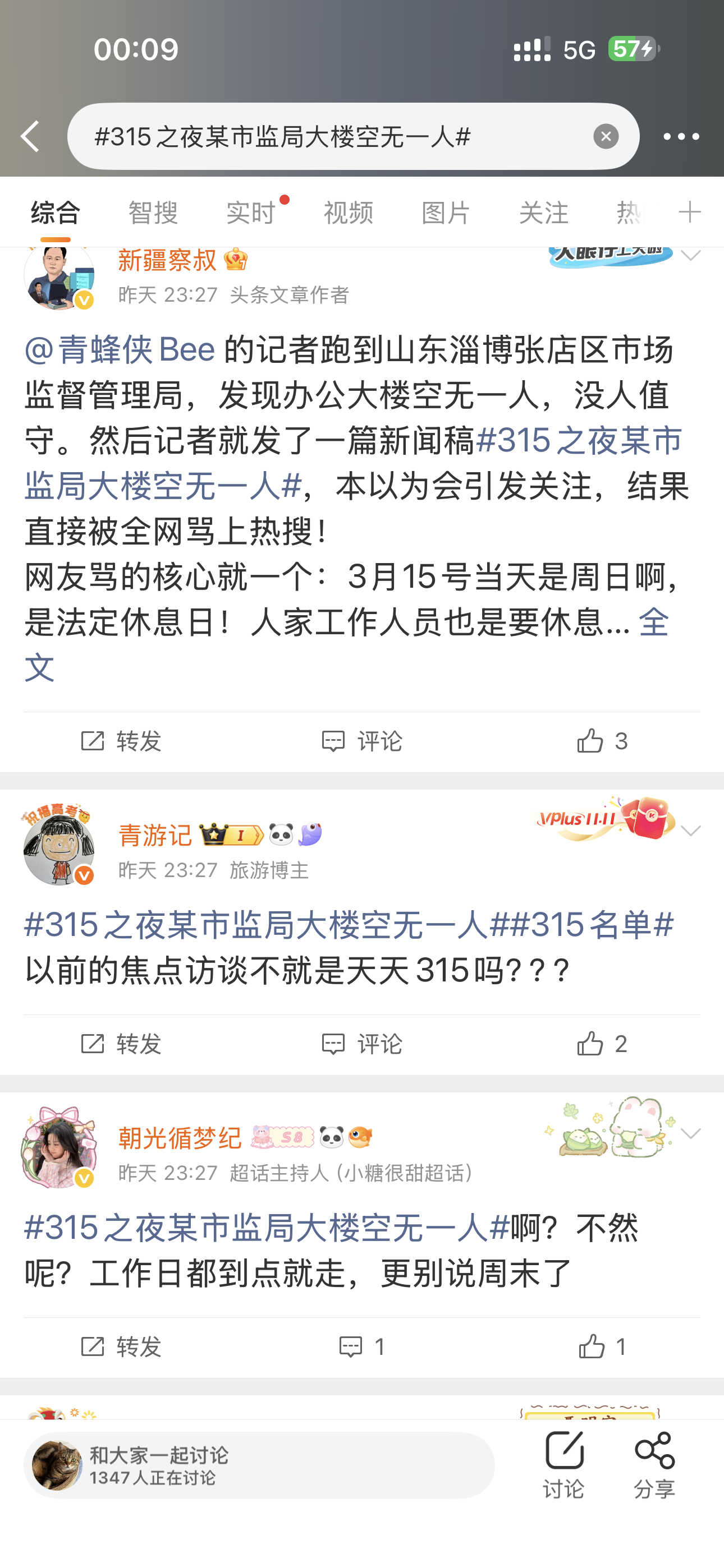 OCR:IMG:00:09 :!!.5G 57 #315之夜某市监局大楼空无一人# 综合 智搜 实时 视频 图片 关注 热 十 新疆察叔 人限行上天明 昨天23:27头条文章作者 @青蜂侠Bee的记者跑到山东淄博张店区市场 监督管理局,发现办公大楼空无一人,没人值 守。然后记者就发了一篇新闻稿#315之夜某市 监局大楼空无一人#,本以为会引发关注,结果 直接被全网骂上热搜! 网友骂的核心就一个:3月15号当天是周日啊 是法定休息日!人家工作人员也是要休息...全 文 转发 评论 3 VPlusII.11 青游记 昨天23:27旅游博主 #315之夜某市监局大楼空无一人##315名单# 以前的焦点访谈不就是天天315吗??? 转发 评论 2 朝光循梦纪5 昨天23:27超话主持人(小糖很甜超话) #315之夜某市监局大楼空无一人#啊?不然 呢?工作日都到点就走,更别说周末了 转发 日1 凸1 C 和大家一起讨论 1347人正在讨论 讨论 分享 公众号·猫仔小七