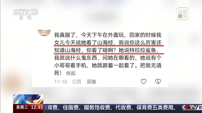 OCR:IMG:CGTV3 新 间 我真服了,今天下午在外面玩,回家的时候我 女儿今天说她看了山海经,我说你这么厉害还 知道山海经,你看了啥啊?她说特拉拉鲨鱼 我就说什么鬼东西,问她在哪看的,她说有个 小哥哥看手机,她就跟着一起看了。把我无语 死!收起 11-10江西 回复 ? ? 星期三12:45 教育费、住宿费、服务性收费、代收费、保育费五类费用。 CCTV新