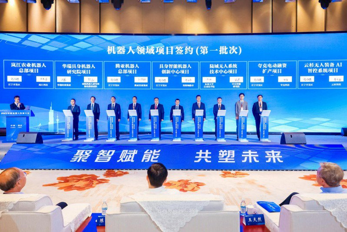 OCR:IMG:机器人领域项目签约(第一批次) 风江农业机器人 华瑞县身机器人 购亚机器人 具身智能机器人 陆域无人系统 奇克电动融资 云杉无人装备AI 总部项目 研究院项目 总部项目 创新中心项目 技术中心项目 扩产项目 智控系统项目 多 155- 6 我个WS 聚智赋能 共塑未来 王天然
