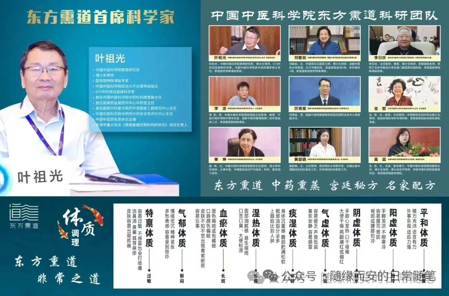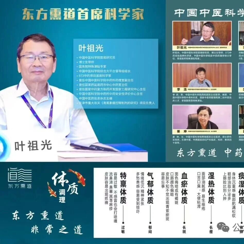OCR:IMG:东方熏道首席科学家 中国中医科学院东方熏道科研团队 叶祖光 中国中国科学院首党研究员 博土生导特 国务院特然津贴专家 ·中国中国科学院综合大平台售导组维长 .973中药项日首科学家 首任中国中医科学院中药所药理室副主任 任国家药监局药市中心中药室主任 任国家中药发方药开发国家工程研究中心主任 中国中医科学院中药所中药安全性评价中心主任 中国中区药健息杂志主编 活,男、中国 天津市重大攻关(青营累控释制的研究)项目负责人 真欧卧 叶祖光 东方熏道 中 药熏蒸 宫 廷秘方 名家配方 体 特禀体质1 纳精抵消牌缴该吓 气郁体质1 血瘀体质 面都威生花 湿热体质 痰湿体质 喜码安艺范精纸弱 气虚体质 手侧千两汗颈镇红 阴虚体质 阳虚体质 特刃疣肺语踏有劲 平和体质 ? 质 弃 东方黑道 调理 重感腹部肥满松软 发 P 东方熏道 都问 长班 非常之道 一 8 公众号 随缘安的常随笔
