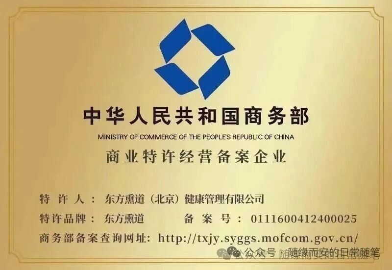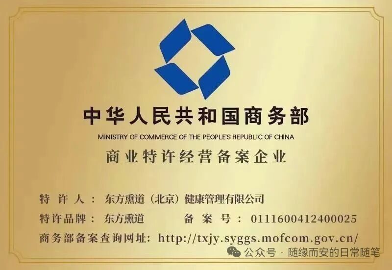 OCR:IMG:中华人民共和国商务部 MINISTRYOFCOMMERCEOFTHEPEOPLESREPUBLICOFCHINA 商业特许经营备案企业 特许人:东方熏道(北京)健康管理有限公司 特许品牌:东方熏道 备案号:0111600412400025 商务部备案查询网址:http://txjy.syggs.mofcom.gov.cn/ 公众号·随缘而安的日常随笔