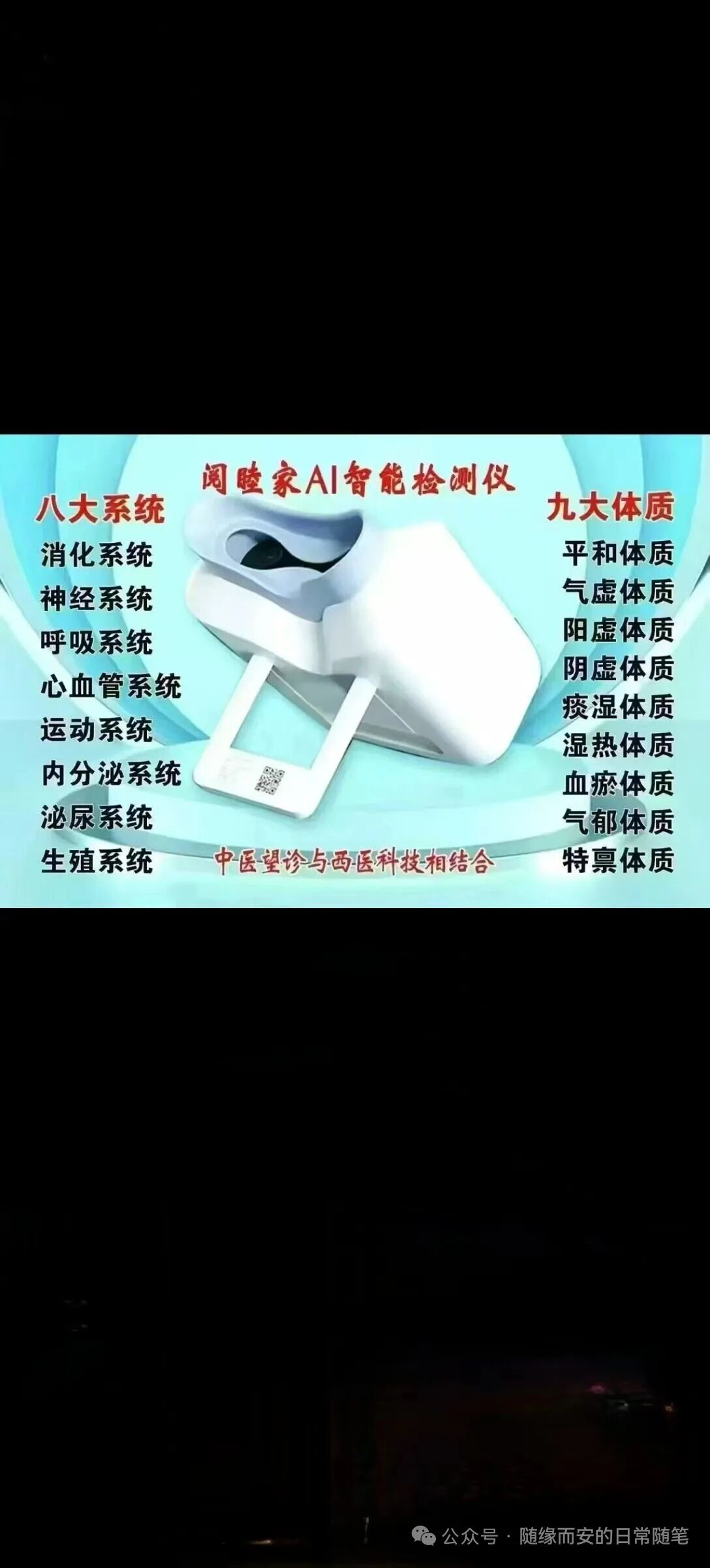 OCR:IMG: 阅睦家AI智能检测仪 八大系统 九大体质 消化系统 平和体质 神经系统 气虚体质 阳虚体质 呼吸系统 阴虚体质 心血管系统 痰湿体质 运动系统 湿热体质 内分泌系统 馨 血体质 泌尿系统 气郁体质 生殖系统 中医望诊与西医科技相结合 特票体质 公众号·随缘而安的日常随笔