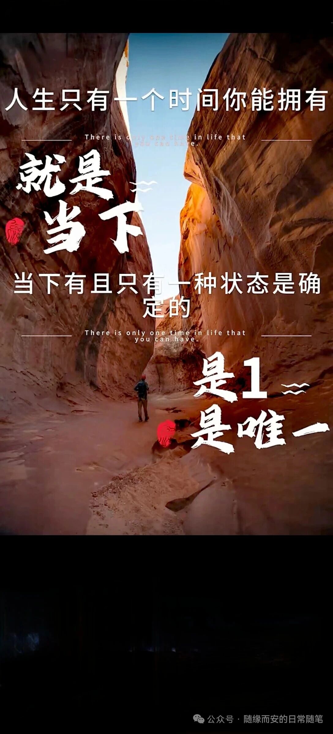 OCR:IMG:人生只有一个时间你能拥有 There inlifethat 就是 当下 当下有且只有一种状态是确 定的 Z Thereisonlyonetimein lifethat youcanhave 是1 是唯一 公众号·随缘而安的日常随笔
