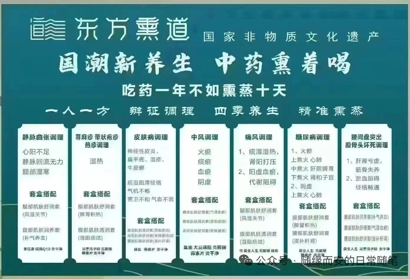 OCR:IMG:鑫东方薰道 国 家非物质文化遗产 国潮新养生 中药熏着喝 吃药一年不如熏蒸十天 一人一方 辩证调理 四季养生 精准熏蒸 静脉曲张调理 荨麻疹带状疤疹 皮肤病调理 中风调理 痛风调理 糖尿病调理 腰间盘突出 热疹调理 股骨头坏死调理 心阳不足 神经性皮炎、 火 1、痰湿湿热, 1、火瘀 静脉回流无力 湿热 扁平疣、湿疹、 痰 肾阳打压 上焦火心肺 1、肝肾亏虚, 腿部湿寒 牛皮癣 血瘀 2、阳虚血瘀, 中焦火肝胆脾胃 筋骨失养 阴虚 代谢阻碍 下焦火肾和子宫 2、 淤血阻碍 痰湿阻滞经络 2、阴虚 经络畅通 套盒搭配 套盒搭配 气机不畅 上焦火心肺 营卫不和气血不调 套盒搭配 套盒搭配 腿部肌肤舒润套 腹部肌肤舒润套 套盒搭配 套盒搭配 (风湿关节) (牌胃积热) 奥部肤经套(气潘本班) 腿部肌肤舒润套 套盒搭配 (风湿关节) 腹部肌肤舒润套 部肌肤润养套(补气养血) 腺部肌肤选润套(湿阳疲结) 腹部肌肤润养套 膜部肌肤透润套 (牌冒积热) 部肌肤透润(湿陵结) 頭肌肤经润套(椎通络) 腹部肌肤舒缓套(气流血) (补气养血) 强队肤润育(椎通络)或 腹部肌肤透润套 腰部肌肤舒润套 (湿阻痰结) 邮航肤润套(滋升新) (湿阻痰结) (滋补肝肾) 腰部肌肤舒润套(滋补肝碍) 墨红素辅属Q10干净 芝病子粉壳黑糖 缝胶慕索片炎干净 鱼油大豆磷脂壳聚罐 悦黄金人生壳融塘维验 黄金人生壳 黄金人生灵芝子粉贵干净 素片炎干净 素片炎干净 公众号 诺