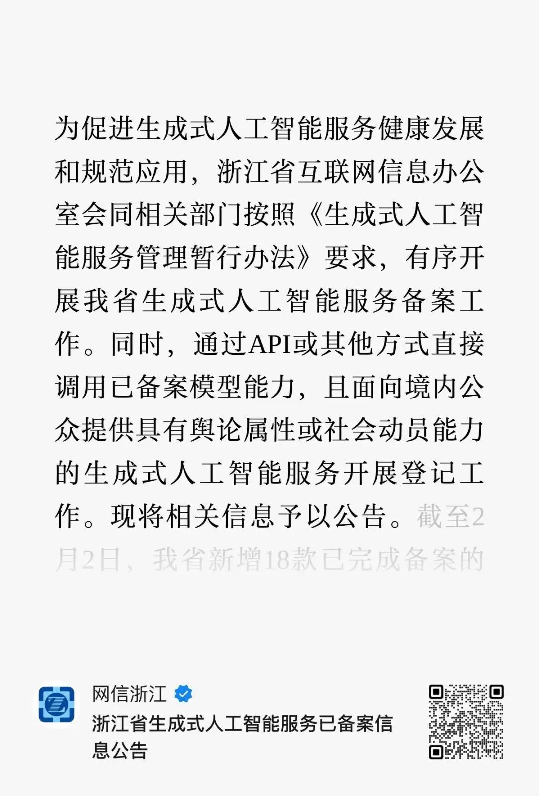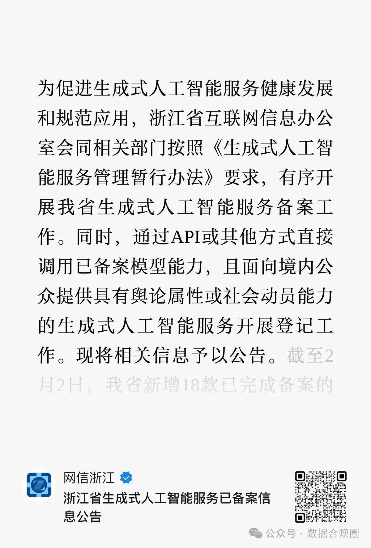 OCR:IMG:为促进生成式人工智能服务健康发展 和规范应用,浙江省互联网信息办公 室会同相关部门按照《生成式人工智 能服务管理暂行办法》要求,有序开 展我省生成式人工智能服务备案工 作。同时,通过API或其他方式直接 调用已备案模型能力,且面向境内公 众提供具有舆论属性或社会动员能力 的生成式人工智能服务开展登记工 作。现将相关信息予以公告。截至2 月2日,我省新增18款已完成备案的 网信浙江 浙江省生成式人工智能服务已备案信 息公告 公众号·数据合规圈
