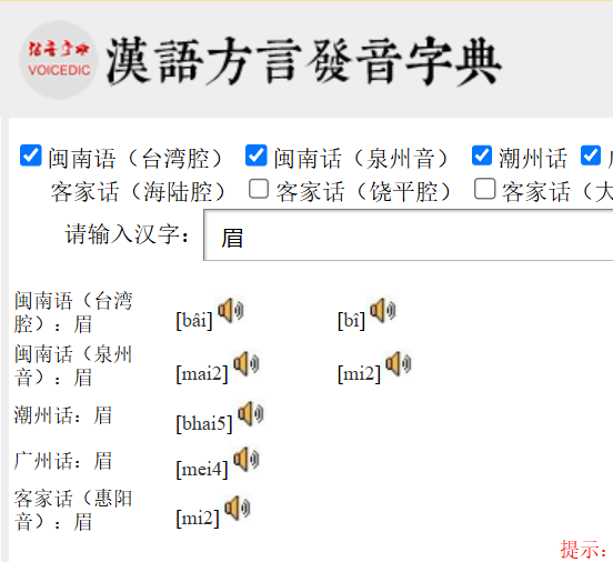 OCR:IMG:汉语方言发音字典VOICEDIC 闽南语(台湾腔)闽南话(泉州音)潮州话客家话(海陆腔)客家话(饶平腔)客家话(大请输入汉字:眉闽南语(台湾腔):眉[baij [bi]闽南话(泉州[mai2][mi2]音):眉潮州话:眉[bhais]广州话:眉[mei4]客家话(惠阳音):眉[mi2]提示: