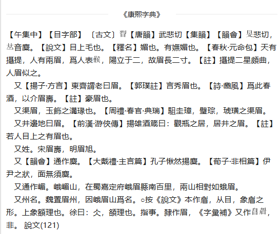 OCR:IMG:《康熙字典》【午集中】【目字部】【古文】智【唐韵】武悲切【集韵】【韵会】悲切,丛音麋。【说文】目上毛也。【名】媚也。有媚也。【春秋·元命包】天有摄提,人有两眉,为人表候,阳立于二,故眉长二寸。【注】摄提二星颇曲,人眉似之。又【扬子·方言】东齐谓老日眉。【郭璞注】言秀眉也。【诗·风】为此春酒,以介眉。【注】豪眉也。又渠眉,玉饰之璟也。【周礼·春官·典瑞】圭璋,璧琮,琥璜之渠眉。又井地日眉。【前汉·游侠传】扬雄酒箴日:观瓶之居,居井之眉。【注】若人目上之有眉也。又姓。宋眉寿,明眉旭。又【韵会】通作。【大戴礼·主言篇】孔子楸然扬。【荀子·非相篇】伊尹之状,面无须麋。又通作嵋。峨嵋山,在蜀嘉定府峨眉县南百里,两山相对如蛾眉。又州名。魏置眉州,因峨眉山为名。按《说文》本作,从目,象之形。上象额理也。徐日:交,额理也。指事。隶作眉,《字量补》又作自,非。说文(121)