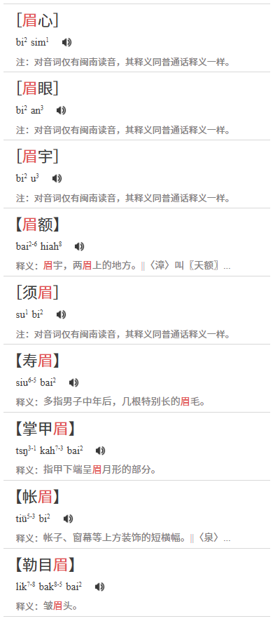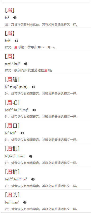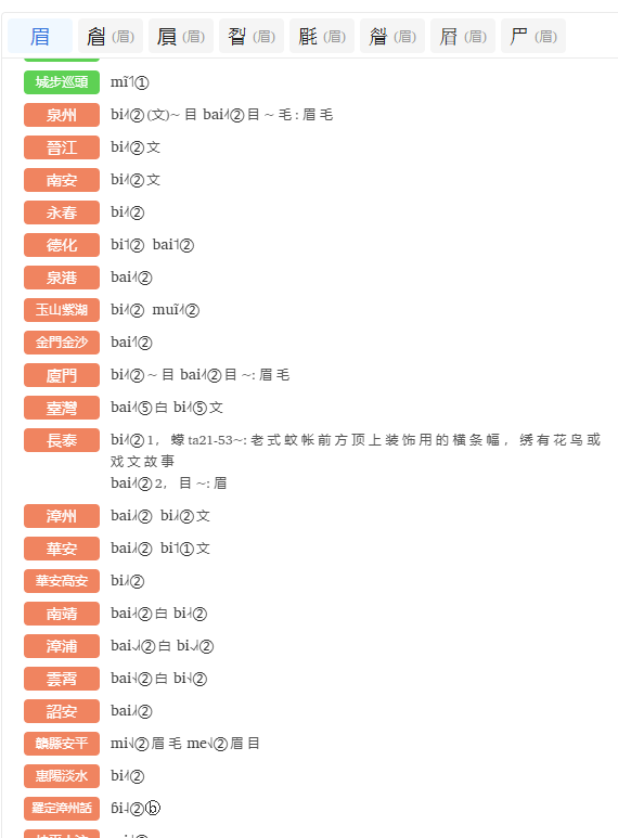 OCR:IMG:眉(眉)(眉)(眉)(眉)(眉)眉(眉)E (眉)城步巡头mi1泉州bi(文目bai目毛:眉毛晋江bi4文南安bi文永春bi4德化bi1bai1泉港bai 玉山紫湖bimui 金门金沙bai1厦门bi目bai目眉毛台湾baiG白bi文长泰bi21,ta21-53:老式蚊帐前方顶上装饰用的横条幅,绣有花乌或戏文故事bai2,目眉漳州baibi文华安baibi1文华安高安bi 南靖bai白bi 漳浦bai白bi 云霄baiN白biN 韶安bai 赣县安平miv眉毛me眉目惠阳淡水bi4罗定漳州话