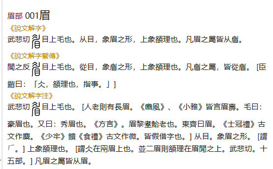 OCR:IMG:眉部001眉《说文解字》武悲切目上毛也。从目,象眉之形,上象额理也。凡眉之属皆从。《说文解字系传》之反目上毛也。从目,象之形,上象额理也。凡之属,皆从。[臣错日:「久,额理也,指事。」]《说文解字注》武悲切目上毛也。【人老则有长眉。《风》、《小雅》皆言眉。毛日:豪眉也。又日:秀眉也。《方言》。眉黎老也。东齐日眉。《士冠礼》古文作麋。《少牢》馈《食礼》古文作微。皆假借字也。]从目。象眉之形。[谓厂。]上象额理也。[谓火在网眉上也。并二眉则额理在眉闲之上。武悲切。十五部。]凡眉之属皆从眉。