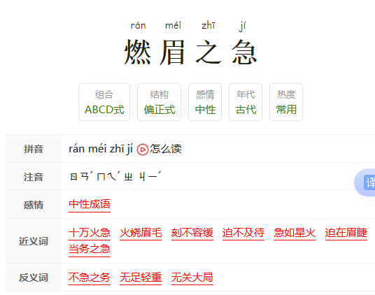 OCR:IMG:ran mei zhtji 燃眉之急组合结构感情年代热度ABCD式偏正式中性古代常用拼音ranmeizhiji怎么读注音马译感情中性成语十万火急火烧眉毛刻不容缓迫不及待急如星火迫在眉睫近义词当务之急反义词不急之务无足轻重无关大局