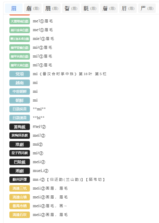 OCR:IMG:眉()肩(眉)智(眉)(眉)(眉)眉()严(眉)大理周城白语mel眉毛川金苹白语me1眉毛碧江洛本卓白语miel眉毛盖坪营盘白语mi眉毛兰坪共兴白语mil眉毛兰坪大羊白语mil眉毛党项mi《番汉合时掌中珠》第18叶第5栏越南mi 中世朝鲜mi 朝鲜mi 日语吴音**mi**日语汉音**bi**黄梅戏mei1黄梅采茶戏meil 淮剧mi 星子西河戏mi 巴陵戏mei 湘剧muei 苏州评弹me【归还韵(兰山韵)】【陌韦切】清远三坑mei画眉,眉毛清远山塘mei画眉,眉毛番禺市桥mei眉毛,画清远石坎meiJ画眉,眉毛