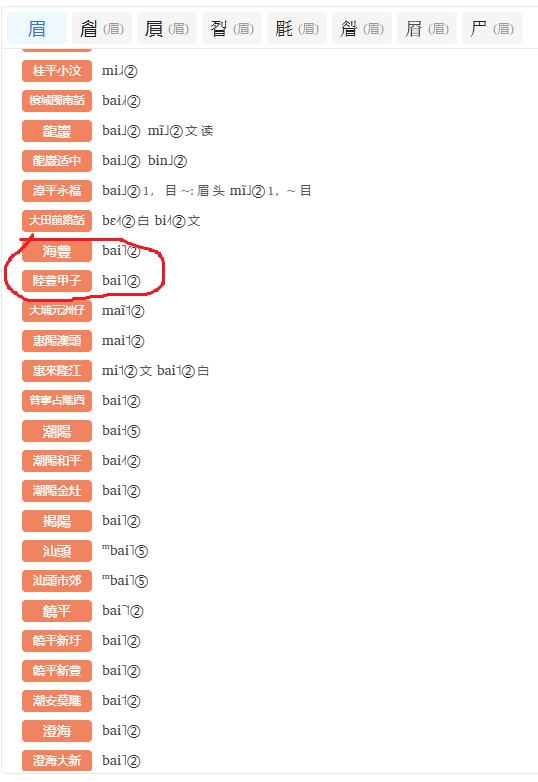 OCR:IMG:眉(眉)肩()(眉)(眉)(眉)眉()严(眉)桂平小汶mil 槟城围南话bai 龙bailmi文读能巖适中baibin 漳平永福baiJ1,目:眉头mi1,目大田前路话be白bi文海丰bail(2陆甲子bail 大埔元洲仔mai1惠阳澳头mai1惠来隆江mi1文bai1白普宁占雕西bai1潮阳bait 潮阳和平bai 潮阳金灶bail 揭阳bail 汕头bail 汕头市郊"bail 饶平bai 平新圩bail 饶平新丰bail 潮安莫雕bai1澄海bail 澄海大新bail