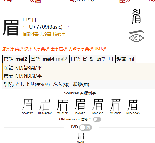 OCR:IMG:眉尸目-U+7709(Basic)-目部4画共9画核心字康熙字典汉语大字典全字库异体字字典M 官话mei2粤语mei4mei2日语韩语越南mi 广韵明/脂B开/平集韵明/脂B开/平训(年寄)(缘)()Sources各源例字眉眉眉眉眉眉眉G0-433C HB1-ACDC T1-525F J0-487D KO-5A36V1-603E KPO-DCA3Oldversions旧版本IVD 眉00Ad