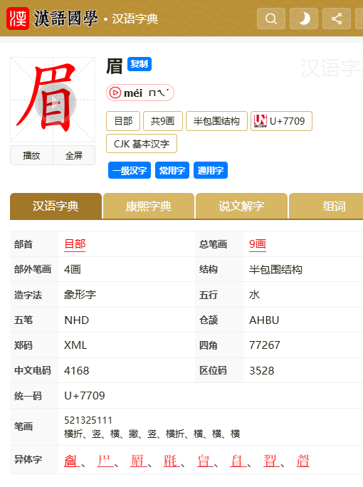 OCR:IMG:漠语国学·汉语字典眉眉复制汉语字meinl 目部共9画半包围结构U+7709CJK基本汉字播放全屏级汉字常用字通用字汉语字典康熙字典说文解字组词部首目部总笔画9画部外笔画4画结构半包围结构造字法象形字五行水五笔NHD 仓颉AHBU 郑码XML 四角77267中文电码4168区位码3528统一码U+7709笔画521325111横折、竖、横、撇、竖、横折、横、横、横异体字