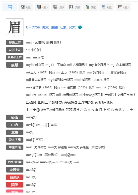 OCR:IMG:眉(眉)(眉)(眉)(眉)智(眉)眉(眉)严(眉)眉U+7709说文康熙汇汉大郑张上古mril (武悲切眉声脂1)白-沙上古*mr[a][r]新最小上古mrimros老广myi切拼音mij白—平转写mii古罗马字my有女罗马字mji高本汉拟音mi王力(1957)拟音mi王力(1985)拟音mji李荣拟音mi邵荣芬拟音mji蒲立本拟音myii郑张尚芳拟音mui潘悟云(20oo)拟音myi潘悟丢(2013)拟音mii潘悟云(2023)拟音miunt(2020)拟音muiunt(2022)凝音miiunt通俗拟音miimsoeg拟音明三B脂平切音系描述止摄摄止开三平脂明方音字量描述上平声6脂广目原貌上平支折合平水目原貌武悲切反切文作目上毛也武悲切二十盛唐myij 中唐myiuntmii辛克北宋mi 蒙古字中原音muei杨耐思mui宁继福mwij薛凤生(音位形式)mwijunt(音位形式)mujunt 西儒耳目资mi@mimuai@miimuii@moei 老国音Mii 普通话mei1国语mei 北京meiM/)