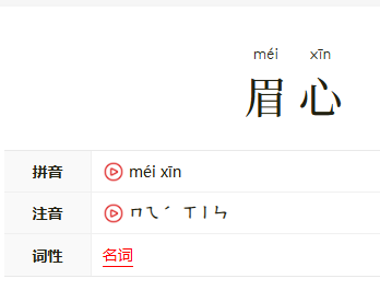 OCR:IMG:mei xin 眉心拼音meixin 注音词性名词