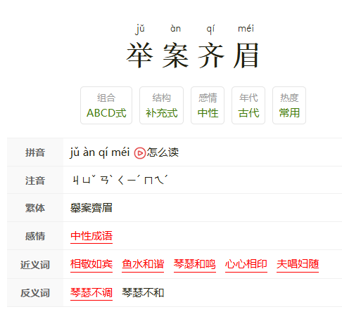 OCR:IMG:ju an qi mei 举案齐眉组合结构感情年代热度ABCD式补充式中性古代常用拼音juanqimei怎么读注音繁体举案齐眉感情中性成语近义词相敬如宾鱼水和谐琴瑟和鸣心心相印夫唱妇随反义词琴瑟不调琴瑟不和
