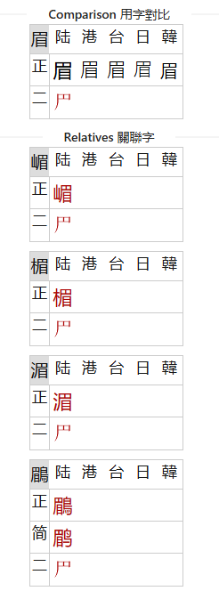 OCR:IMG:Comparison用字对比陆港台日韩正Relatives关联字嵋陆港台日韩正嵋二严楣陆港台日韩正楣二严湄陆港台日韩正湄二严陆港台日韩正眉简鹃严