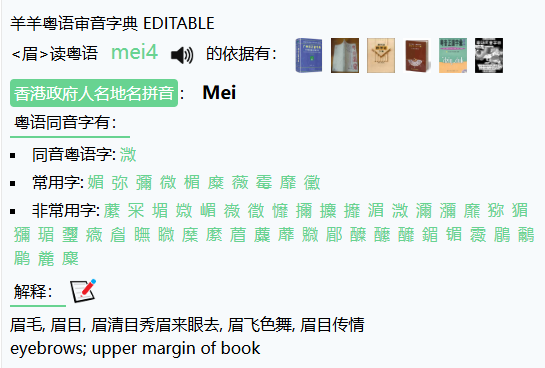 OCR:IMG:羊羊粤语审音字典EDITABLE 眉读粤语mei4)的依据有:香港政府人名地名拼音Mei 粤语同音字有:一同音粤语字:激常用字:媚弥弥微楣糜薇霉靡霉非常用字采媚微嵋微微湄微澜靡猕猬弥瑁症糜摩苜萝萝酿酿酿媚霉鹃鹃,解释:眉毛,眉目,眉清目秀眉来眼去,眉飞色舞,眉目传情eyebrows;uppermarginofbook