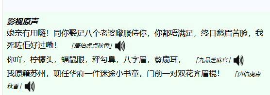 OCR:IMG:影视原声娘亲有用喔!同你娶足八个老婆嚟服侍你,你都唔满足,终日愁眉苦脸,我死佰好过嘞!「唐伯虎点秋香」)你吖,柠檬头,蝠鼠眼,秤勾鼻,八字眉,葵扇耳,[九品芝麻官]我原籍苏州,现任华府一件迷途小书童,门前一对双花齐眉棍![唐伯虎点秋香)