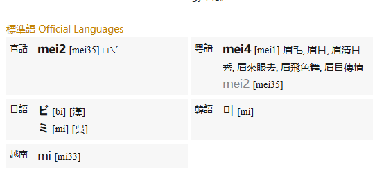 OCR:IMG:标语OfficialLanguages 官话mei2[mei35]粤语mei4[meil]眉毛,眉目,眉清目秀,眉来眼去,眉飞色舞,眉目傅情mei2[mei35]日语[[汉]韩语[mi][]越南mi[mi33]