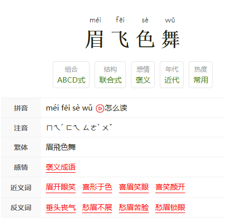 OCR:IMG:mei fei se wu 眉飞色舞组合结构感情年代热度ABCD式联合式褒义近代常用拼音mei fei se wu 怎么读注音繁体眉飞色舞感情褒义成语近义词眉开眼笑喜形于色喜眉笑眼喜笑颜开反义词垂头丧气愁眉不展愁眉苦脸愁眉锁眼