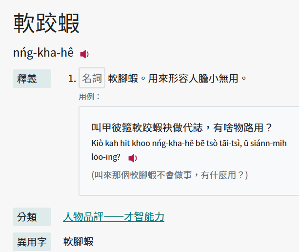 OCR:IMG:软跤虾nng-kha-he 释义1.名词软脚虾。用来形容人胆小无用。用例:叫甲彼箍软跤虾袂做代志,有啥物路用?Kio kahhitkhoonng-kha-hebetsotai-tsiusiann-mi loo-ing?(叫来那个软脚虾不会做事,有什么用?)分类人物品评——才智能力异用字软脚虾